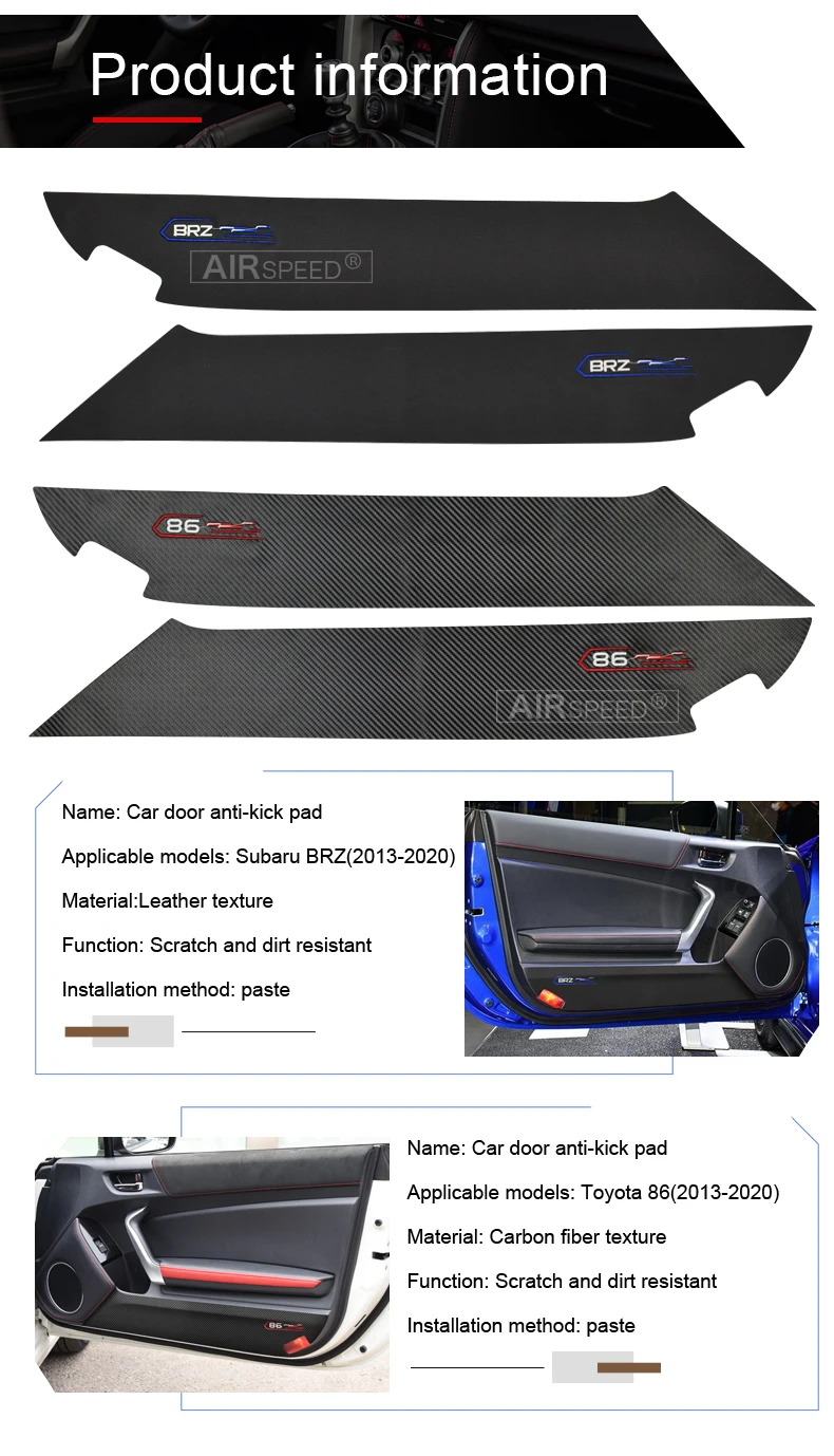 Изделия изготовлены из высококачественного кожаного материала с приятными текстурами. Изделия изготавливаются в соответствии с оригинальными размерами, которые идеально подходят. Интерьер будет сильно очарован их украшениями и не будет испорчен их простой установкой. Посылка включает в себя: 2 шт./компл. Материал: кожа Совместимые модели: для Subaru BRZ Toyota 86 2013-2020