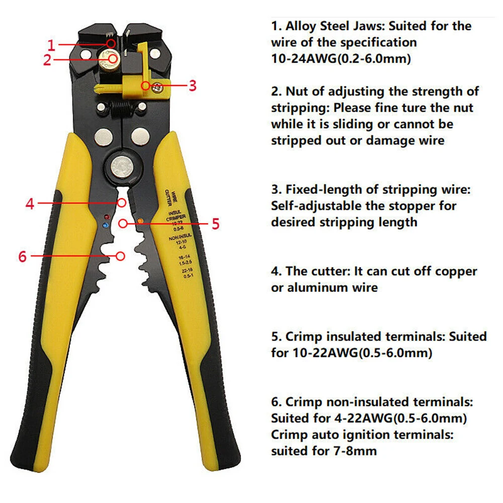 * Для зачистки провода от AWG24-10 (0,2 ~ 6.0mm ²). Набор зачистки, обрезки, обжимной клеммы три функции в одном инструменте