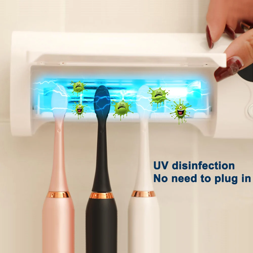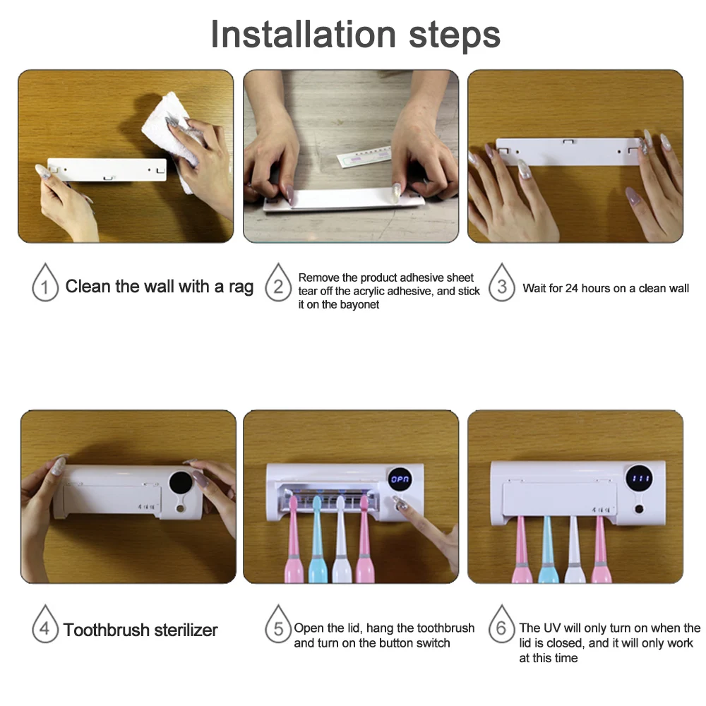Дизайн 2-в-1: с держателем зубной щетки и функцией стерилизатора, вы можете разместить на ней 4 зубных щетки, которые не загрязняют вашу зубную щетку, храните зубную щетку в том месте, где она должна оставаться, и держите ванную в порядке.