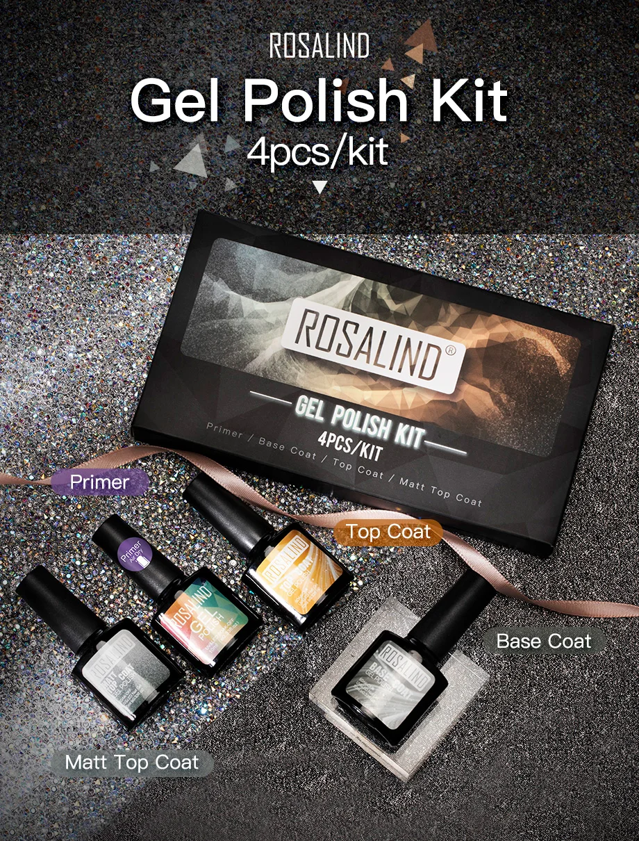ROSALIND 4 шт./набор гель-лака набор грунтовка базовое пальто верхнее покрытие матовое верхнее покрытие 10 мл/уп. яркое для дизайна ногтей