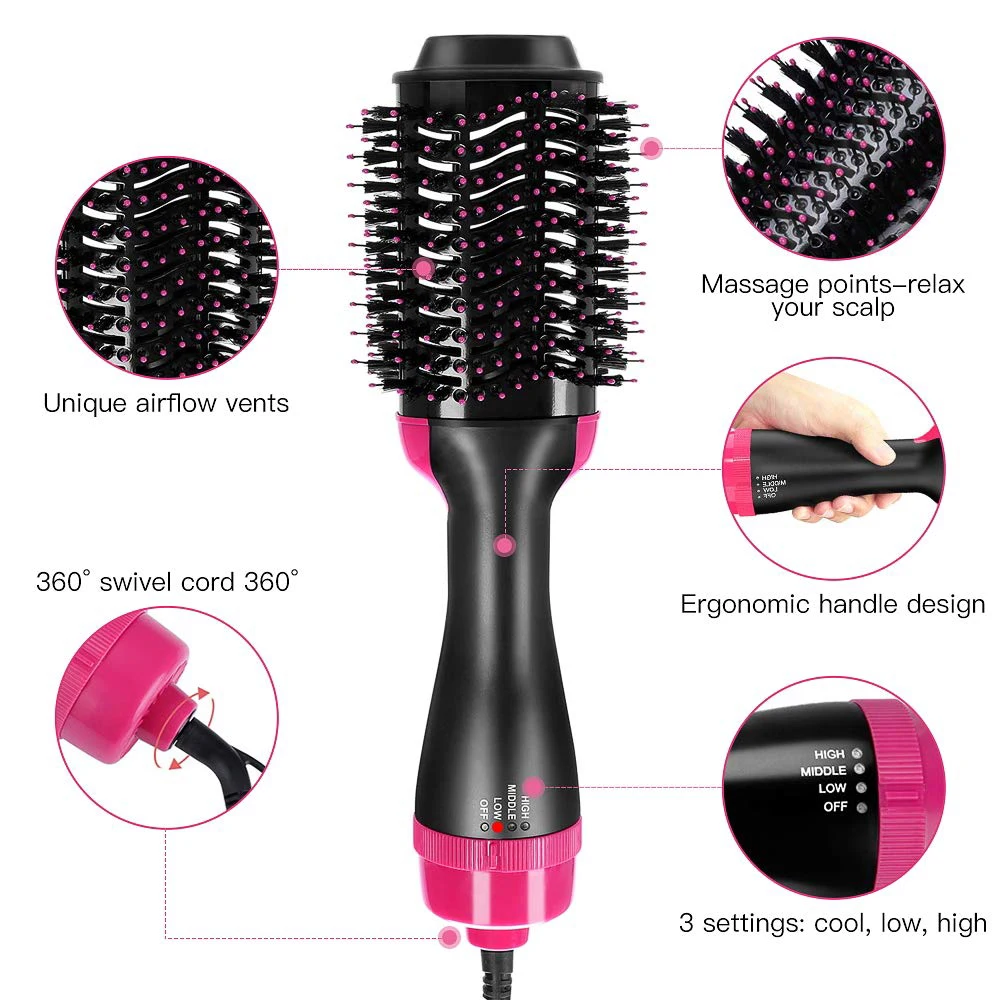 Features: 2 in 1 Gives your hair style efficiently while it simultaneously dries each strand. Temperature control Maintains precise temperature with 2 heat settings plus cool setting. Unique airflow vents Enhanced design for faster drying and better coverage. Oval design Gently rotates left and right for both inner outer-facing curls, providing flexibility to style. Ceramic coating plate with ions technology Provides powerful airflow with negative ion to fast dry and take care your hair. Ergonomic handle For maximum comfort and ease of use during styling. Power: 1000W Cable Length: 160cm Temperature Controller: Knob Applicable Hair: Dry&Wet Diameter of thermal conductor: 16-20mm Material of thermal plate/bar: Tourmaline ceramic Single Voltage (V): 110V (US plug) - 220 V(EU,AU,UK Plug) Powered Source: Electric Power Cord Tail Assembly Mode: 360° rotatable