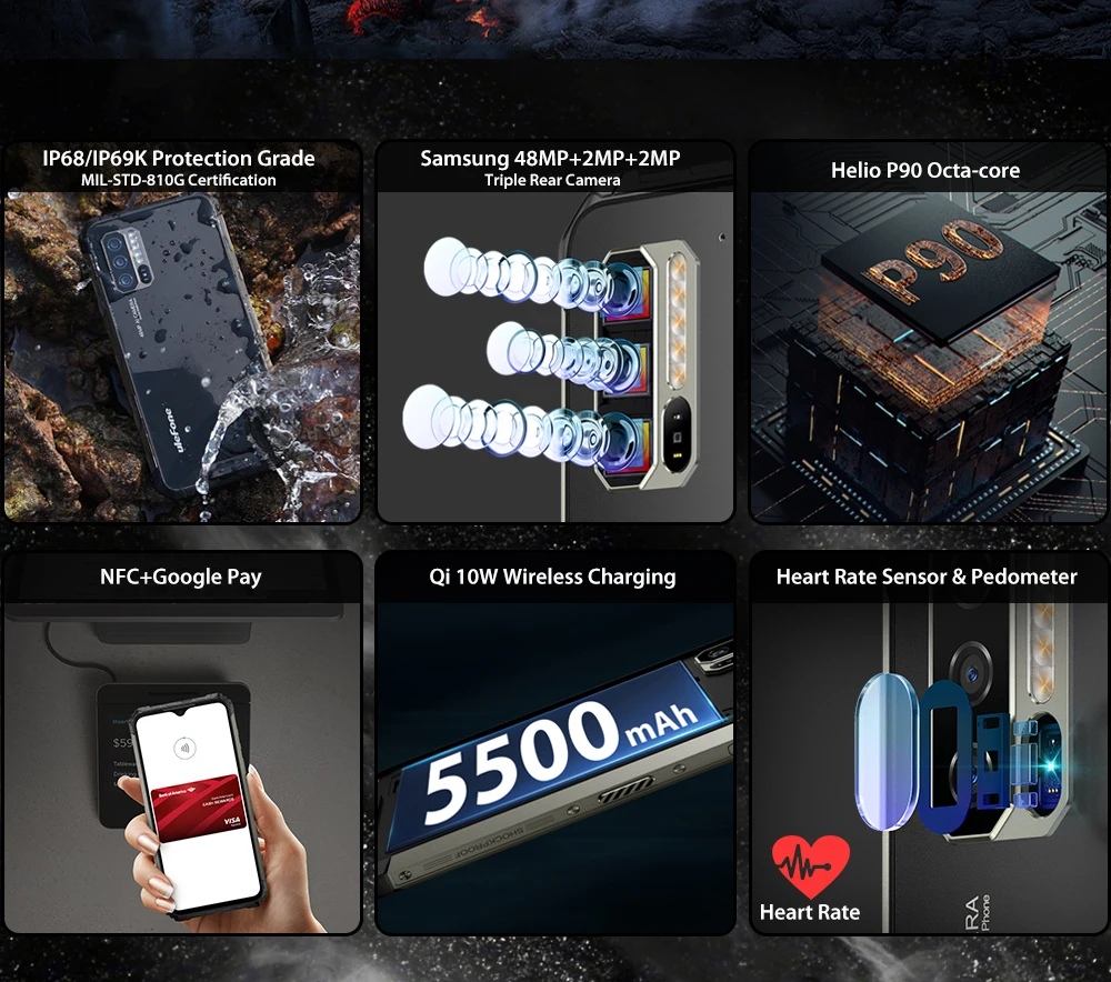 -ОС: Стоковая Android 10,0 -Процессор: Helio P90 (MT6779 2,2 ГГц -IP68 IP69K MIL-STD-810G-дисплей: 6,3 "капля FHD + -WIFI: 802,11 a/ac/b/g/n (2,4G + 5G) -Версия Bluetooth:®5,0 -ОЗУ + ПЗУ: 4 Гб + 128 Гб (2 ТБ расширяемый, не входит в комплект) -Аккумулятор: 5500 мАч -Поддержка беспроводной зарядки 10 Вт -Поддержка NFC + OTG -Поддержка распознавания лица/отпечатков пальцев -Тыловая камера: Samsung 48MP (F/1,7) + 2MP (F/2,2) + 2MP (F/2,2) -Пиксель фронтальной камеры: 16 МП F/2,0 -Особенности: датчик ускорения, g-сенсор, p-сенсор, l-сенсор, e-компас, гироскоп, NFC, бароцептор, датчик сердечного ритма, кулонметр, GPS + ГЛОНАСС + BEIDOU + Galileo