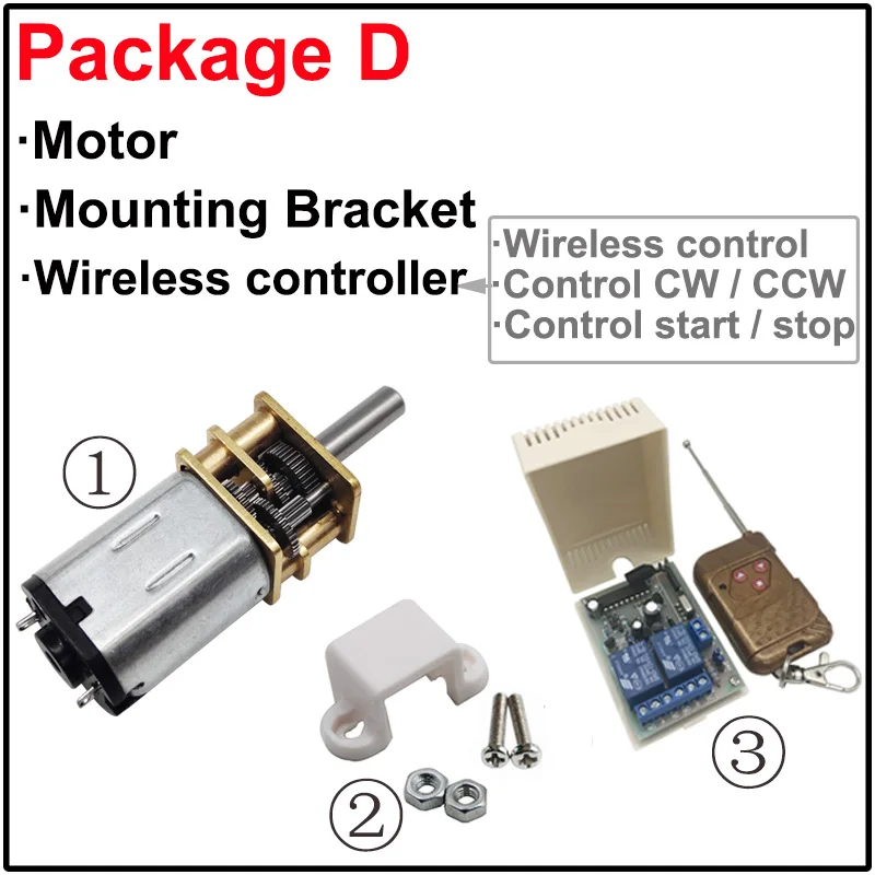 Посылка A: Вы получите мотор; Посылка B: вы получите мотор и монтажный кронштейн; Посылка C: вы получите мотор и беспроводной контроллер; Беспроводной контроллер может управлять направлением вращения двигателя, запускать или останавливать и может удаленно управлять двигателем с помощью пульта дистанционного управления, но не рекомендуется находиться слишком далеко Посылка D: вы получите двигатель; Монтажный кронштейн и беспроводной контроллер; Например 1, скорость двигателя вы выбираете 3 в 15 об/мин и посылка A; Вы получите двигатель с 3 в 15 об/мин; Например 2, скорость двигателя, который вы выбираете 6 в 30 об/мин и посылка B; Вы получите двигатель 6 в 30 об/мин и монтажный кронштейн;