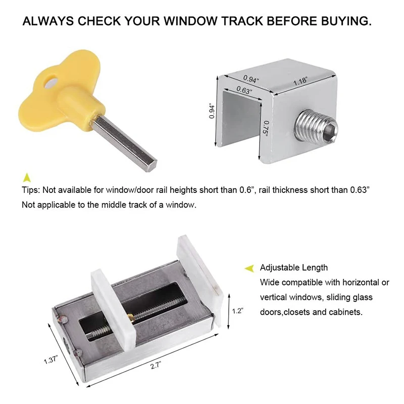 Подходит для большинства горизонтальных раздвижных окон и дверей: позволяет окну блокировать в проветривающем положении. Стиль из нержавеющей стали и алюминиевый сплав, оснащенный шестигранным ключом, если ключ потеряется, вы можете использовать шестигранный ключ.