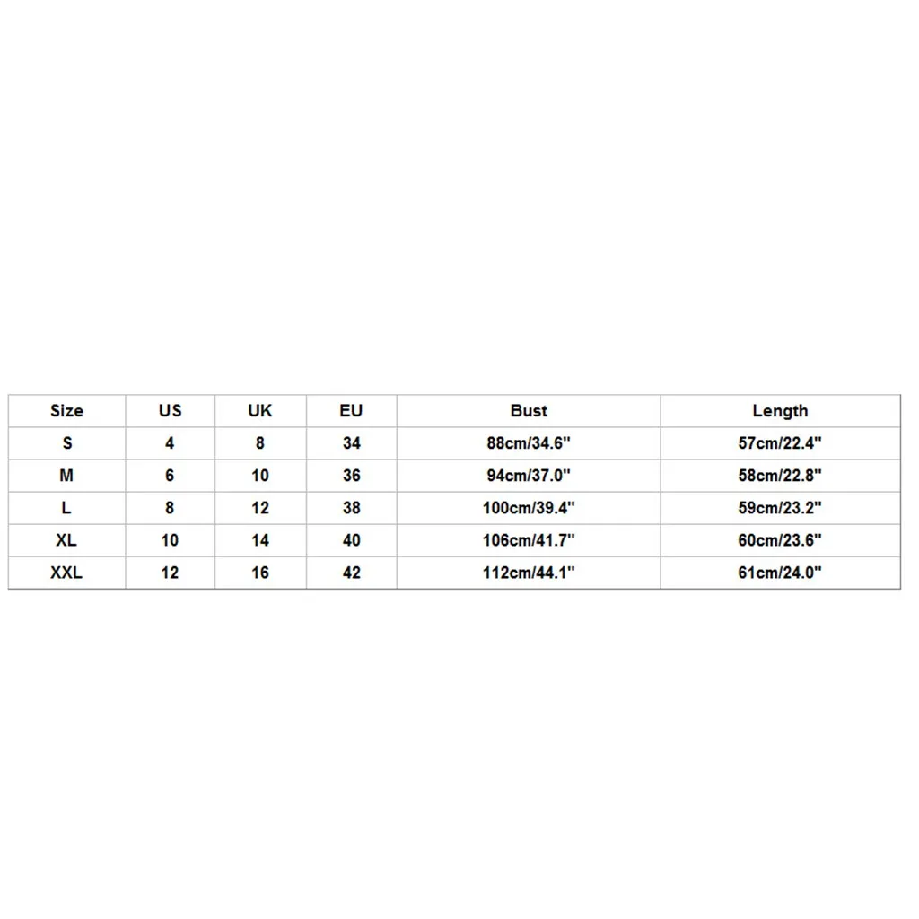 Размер США Великобритания ЕС Бюст Длина S 4 8 34 88 см/34,65'' 57 см/22,44'' М 6 10 36 94 см/37,01'' 58 см/22,83'' L 8 12 38 100 см/39,37'' 59 см/23,23'' XL 10 14 40 106 см/41,73'' 60 см/23,62'' XXL 12 16 42 112 см/44,09'' 61 см/24,02''