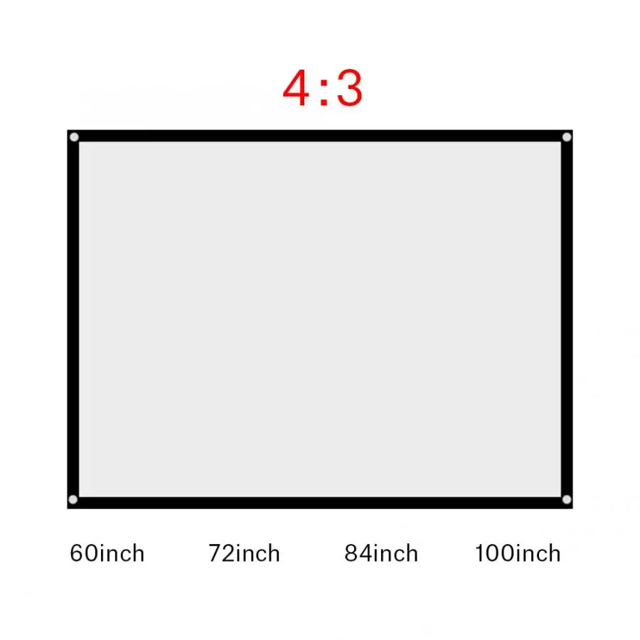 Вариант (Диагональ) Размер (длина * ширина) 60 дюймов 122*91 см/48*35,8 дюйма 72in 146*110 см/57,5*43,3 дюйма 84 дюйма 171*128 см/67,3 * 50.4in 100 дюймов 203*152 см/79,9*59,8 дюйма