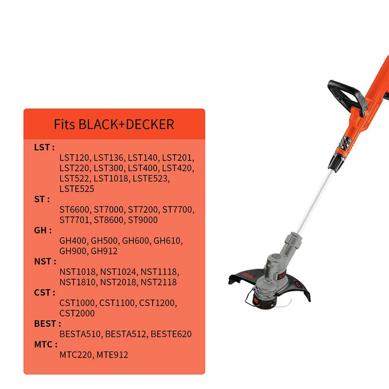 [Совместимые модели]: совместим с триммером black and decker string: GH400 , GH500 , GH600 , GH610 , GH900 , GH912 , BESTA510 , BESTA512 , BESTE620 , LST120 , LST136 , LST140 , LST201 , LST220 , LST300 , LST400 , LST420 , LST522 , LST1018 , LSTE523 , LSTE525 , ST6600 , ST7000 , ST7200, ST7700 , ST7701 , ST8600 , ST9000 , NST1018 , NST1024 , NST1118 , NST1810 , NST2018 , NST2118 , CST1000 , CST1100 , CST1200 , CST2000 , MTC220 , MTE912.