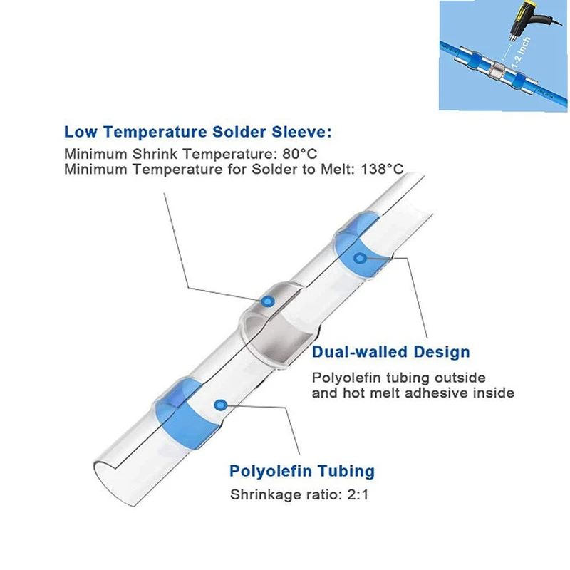 Не требуется обжима. Термоусадочные соединители для припоя обеспечивают точный контроль при вставке проводов внутри. Просто поместите зачищенные провода в припой и используйте пистолет горячего воздуха, чтобы закончить проводное соединение. Сделайте правильно спаянные и водонепроницаемые соединения менее чем за 30 секунд