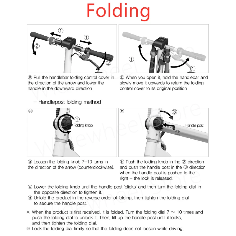 На руль велосипеда (метод складывания A) Вытяните складную крышку управления руля в направлении стрелки и опустите ручку в направлении вниз. B) когда вы открываете его, удерживайте руль и медленно перемещайте его вверх, чтобы вернуть складную крышку управления в исходное положение. -Прочной метод складывания A) ослабьте складную ручку 7-10 поворотов в направлении стрелки (против часовой стрелки). B) нажмите на складную ручку в ② направлении и нажмите на ручку в ③ направлении, когда рукоятка нажимается вправо-замок отпущен. C) Опустите складную ручку до тех пор, пока ручка не «кликнет», а затем поверните складной циферблат в противоположном направлении, чтобы затянуть его. D) разверните изделие в обратном порядке, а затем затяните складной циферблат, чтобы закрепить ручку. * Когда продукт впервые получен, он сложен. Поверните складной циферблат 7-10 раз и нажмите на складной циферблат, чтобы разблокировать его. Затем Поднимите ручку до фиксации, а затем затяните складной циферблат. * Надежно зафиксируйте складной циферблат, чтобы он не распухался во время вождения.