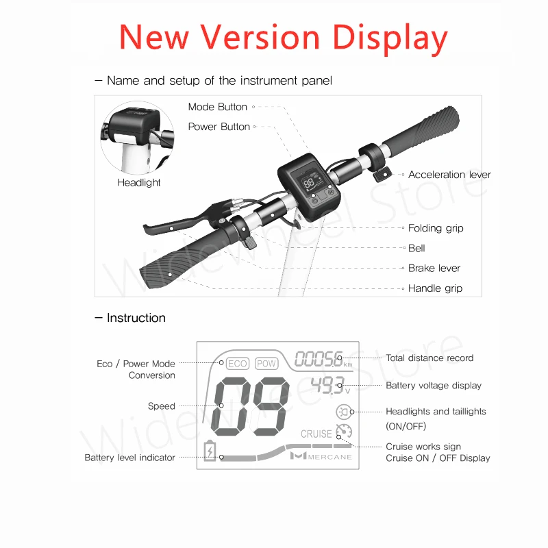 -Название и настройка приборной панели Кнопка переключения режима Мощность кнопка Задний фонарь Ускорение рычаг Складная ручка Колокол Тормозной рычаг Ручка -Инструкция Преобразование режима Eco/Power Скорость Батарея индикатор уровня заряда В общей сложности дистанционная запись Батарея напряжение дисплея Фары и задние фонари (ВКЛ./ВЫКЛ.) Круиз работает знак Дисплей круиз ВКЛ/ВЫКЛ