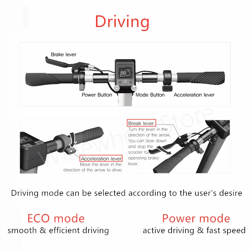 1. Нажатие кнопки около 2 секунд включит питание. 2. Установите желаемый режим вождения (проверьте «Настройки приборной панели») 3. Когда питание включено, нажмите на скутер и аккуратно нажмите на ускоритель для работы. 4. Используйте тормозной рычаг для замедления и остановки. 5. При включении питания нажмите кнопку в течение 2 секунд, чтобы выключить питание. ★Примечание: есть встроенная функция kick & go, поэтому при вождении в первый раз, нажмите на продукт с одной ногой, чтобы kickboard мог двигаться вперед. После этого вы должны использовать ускоритель для вождения. ● Режим вождения может быть выбран вручную по желанию пользователя. Эко-режим Этот режим позволяет плавно и эффективно управлять автомобилем, регулируя выход и ускорение. Мощность режим Использование rs может использовать максимальный выход и крутящий момент продукта. Этот режим позволяет активному вождению с быстрой скоростью отклика. Однако в режиме питания скорость автоматически ограничена, когда скорость превышает 25 км/ч в соответствии с законом.