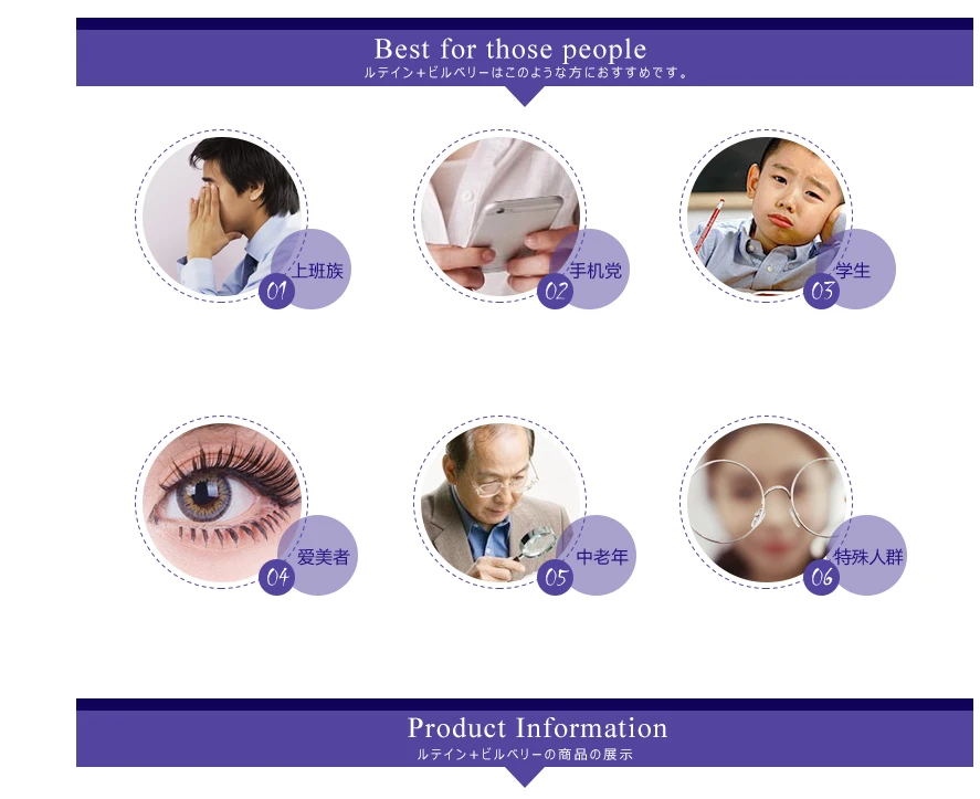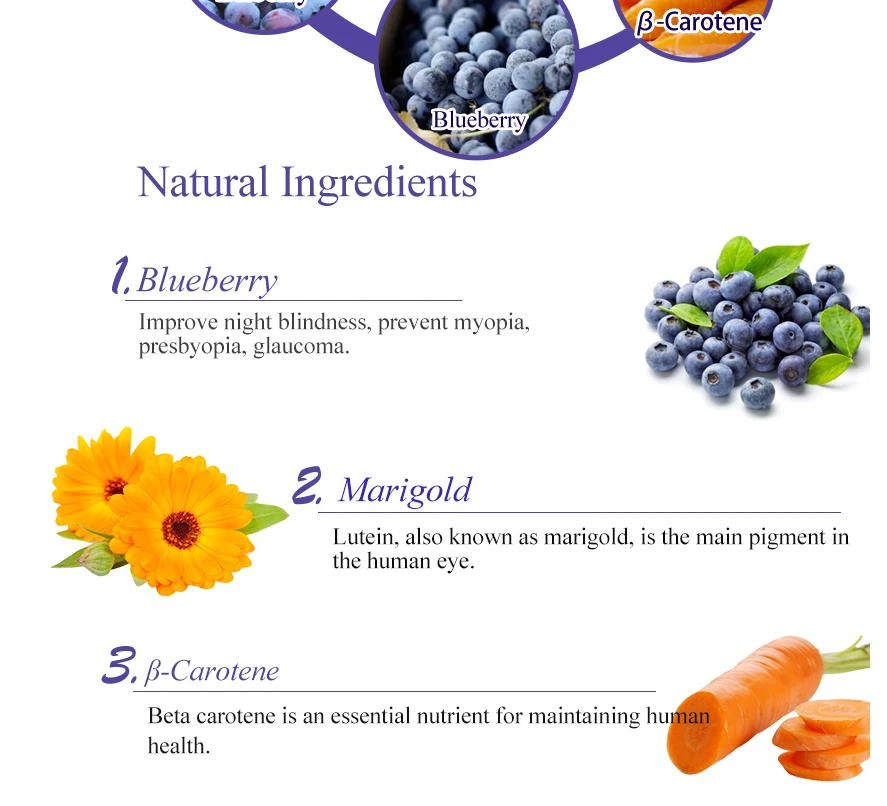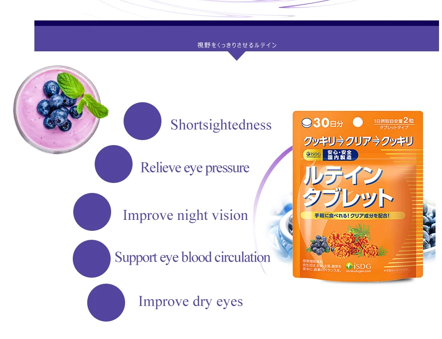 (Происхождение) Япония (Функции) оказывает защитное действие на глаза, улучшает кровообращение глаз и снижает внутриглазное давление. 【Direction】 2 таблетки ежедневно, жевать непосредственно или с водой (Объём) 60 доз (Срок годности) 2022 (Состав) -Черника Поддерживает кровообращение глаз для максимальной остроты зрения. Улучшение ночного зрения за счет увеличения выработки глазного пигмента, который помогает глазам адаптироваться к темноте. -Лютеин Защищает глаза от повреждения солнечным светом. -Черника -Бета-каротин (Кто может принимать) Подростки, Взрослые, Студенты. (Противопоказания) Если Вы беременны, кормите грудью или имеете какое-либо заболевание, пожалуйста, проконсультируйтесь с Вашим врачом, до того, как начнёте приём. Пейте больше воды во время курса приёма, так продукт усвоится лучше. Не употребляйте кофе или чай во время приёма продукта. Питательные вещества нашего продукта начинают оказывать эффект спустя короткое время после начала приёма. Но из-за индивидуальной ситуации, время будет меняться от 2 недель до 3 месяцев. Как правило, курс лечения составляет 3 пакета, поэтому рекомендуется продолжать принимать продукт в течение 3 месяцев, чтобы достигнуть наилучшего результата.