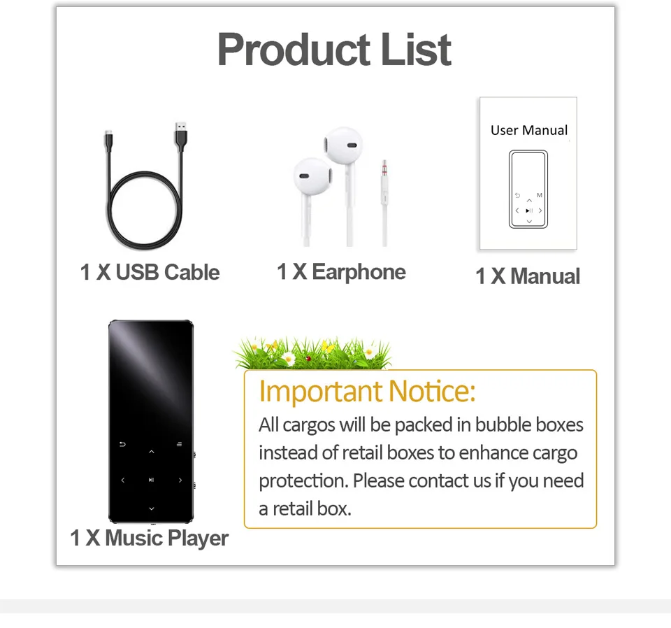 Посылка включает в себя: 1 x MP3 плеер USB кабель (1 шт.); 1 х проводные наушники Руководство пользователя (1 шт.) Обратите внимание, что проводные наушники будут отправлены в качестве бесплатного подарка, но будут даны в случайном порядке, пожалуйста, преобладайте.