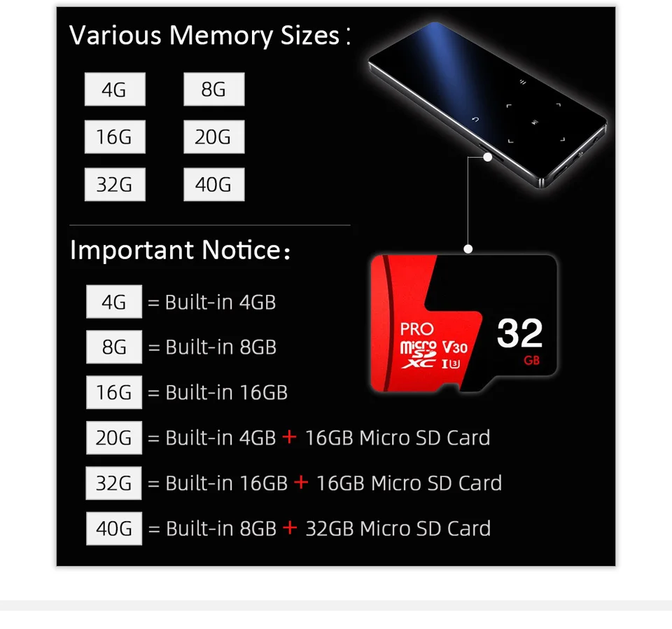 Есть 6 видов «размер памяти». В некоторые из них уже включена карта Micro SD. 4 ГБ означает Встроенный 4 Гб 8 ГБ означает Встроенный 8 Гб 16 Гб означает Встроенный 16 Гб 20 Гб означает Встроенный 4 Гб плюс 16 Гб Micro SD карта 32 Гб означает Встроенный 16 Гб плюс 16 Гб Micro SD карта 40 ГБ означает Встроенный 8 Гб плюс 32 ГБ Micro SD карта