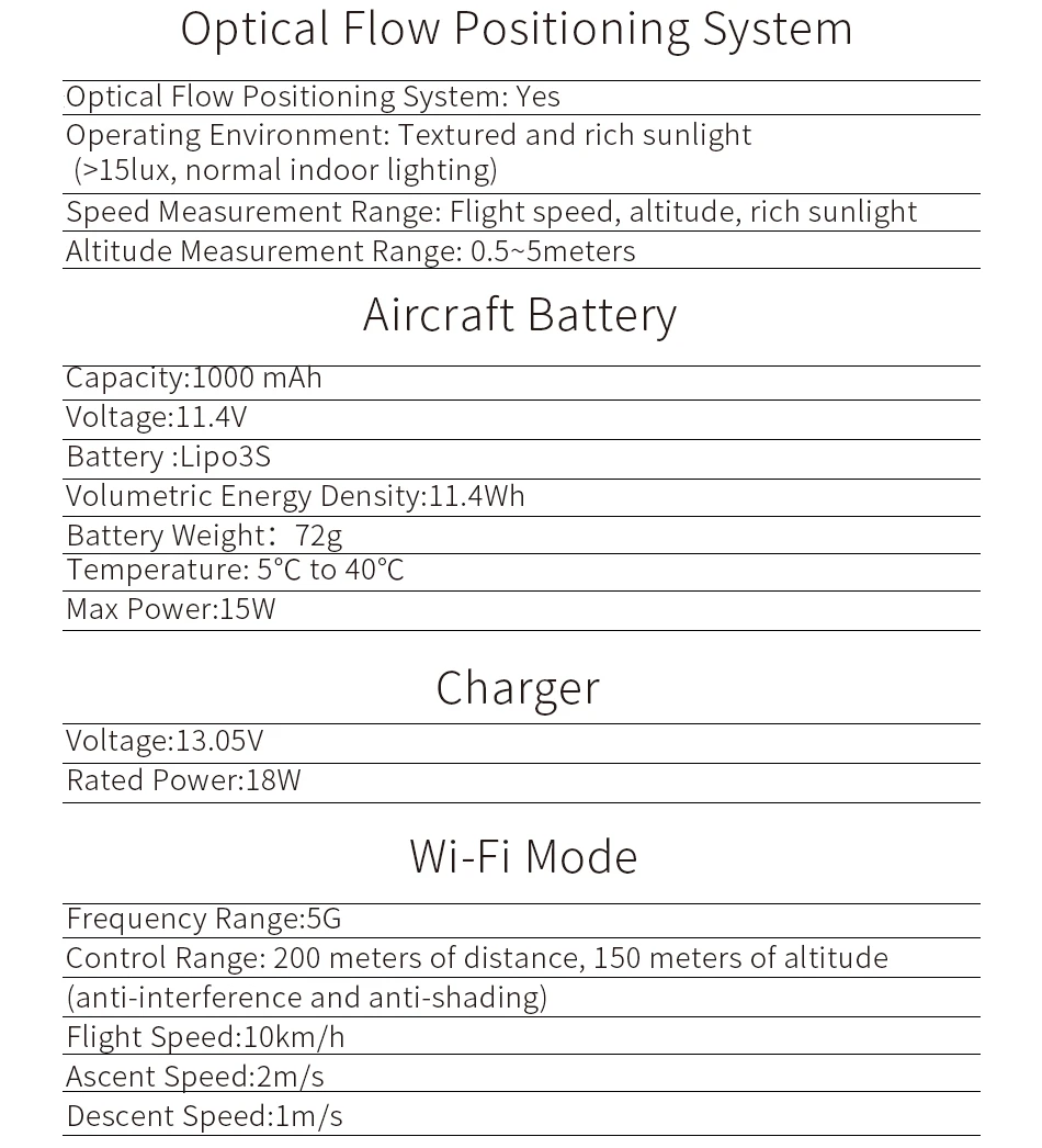 Торговая марка: JJRC Материал: ABS/PS Тип нажатием кнопки: Квадрокоптер Особенности: бесщеточная версия Тип двигателя: бесщеточный двигатель Функции: Аэрофотосъемка, удерживание высоты в воздушном прессе, камера, непрерывная съемка, вперед/назад, FPV, удержание высоты GPS, автоматическое возвращение одной кнопкой, следование одной клавишей, посадка одной клавишей, включение одной кнопки, оптическое позиционирование потока, точка заинтересованности, поворот влево/вправо, вверх/вниз Сенсор: барометр, оптический поток Максимальная скорость: 20 км/ч Встроенный гироскоп: 6-осевой гироскоп Комплект типов: RTF Уровень: продвинутый уровень Пульт дистанционного управления Управление: 2,4 ГГц Беспроводной дистанционного Управление Канал: 4-Каналы Режим радио: режим 2 (левая дроссельная заслонка), приложение WiFi Детальное Расстояние управления: 1000 м Совместимость с дополнительными карданными: нет Расстояние FPV: 200 - 300 м Мощность передатчика: Встроенная перезаряжаемая батарея Аккумулятор: 11,4 в 1000 мАч Li-ion Время полета: 14-15mins Посылка Вес: 1,115 кг Размер продукта (Д x Ш x В): 14,80x14,50x6,00 см/5,83x5,71x2,36 дюймов Посылка размеры размер упаковки (Д x Ш x В): 31,00x23,00x12,00 см/12,2x9,06x4,72 дюйм (ов) Посылка: 1 Радиоуправляемый Дрон с батареей, 1 пульт дистанционного управления (батарея входит в комплект), 1 зарядное устройство, 1 usb-кабель, 2 пропеллера, 1 гаечный ключ типа L, 1 х Руководство на китайском и английском языках Продукт Безопасность отказ от ответственности: Мы не несем никакой ответственности за неправильное использование этого или любого другого продукта. Все наши продукты проходят тщательную проверку на соответствие строгим и строгим стандартам контроля качества. Для некоторых продуктов (например, игрушек, ножей и т. д.), мы рекомендуем надлежащий контроль, так как мы не можем нести ответственность за неправильное использование или несчастные случаи. Небольшой Запчасти отказ от ответственности: Эти игрушки содержат мелкие детали, не для детей в возрасте до 3 лет, чехол для глотания или удушья. Мы не несем никакой ответственности за неправильное использование этого или любого другого продукта.