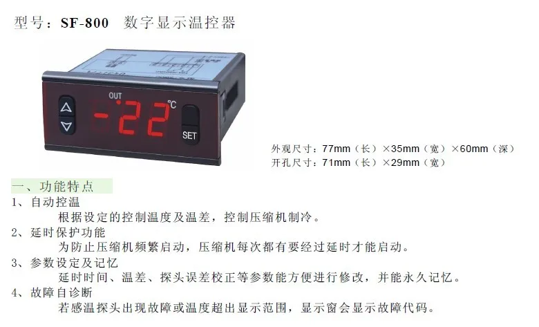 4、Fault self-diagnosis delay time、The temperature difference、Parameters such as probe error correction can be easily modified,And to your long term memory。If the temperature sensor fails or the temperature exceeds the display range,The display window displays the fault code。