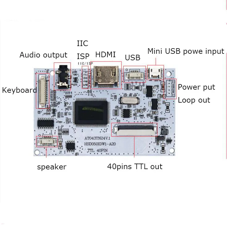1. Интерфейс питания MIRCO USB, Стандартный источник питания 5 В, должен быть больше 1,5а, рекомендуется 2А. Недостаточная мощность вызовет мерцание ЖК-экрана, помехи или шум звука, прерывистый и т. Д. 2. Все с отделением для карт, 1,25 мм, SMD разъем 3,1 HDMI вход сигнала, и этот IC поддерживает HDMI 1,2 4.HDMI является высококачественным позолоченным сиденьем 5. Интерфейс экрана использует высококачественный Позолоченный разъем-40PIN-HS050IDW1-A20 общее определение 6. Поддержка выходной мощности усилителя, 8 Euro-2W / 4 Euro-2W 7. Приводная плата имеет специальную схему, которая может управлять светодиодный подсветкой в пределах 30 в, и поддерживает максимальный ток на выходе 200 мА. 8. Поддержка, TTL-40P стандартный интерфейс (см. HSD050IDW1-A20,), 9. Стандартный 5-Клавиша клавиатуры интерфейс, а также поддерживает двухцветный светодиодный индикатор 10. Поддержка TTL сигнала, специальный экран требует платы адаптера 11. Для других моделей, пожалуйста, проверьте характеристики ЖК-экрана или обратитесь в службу поддержки клиентов. 12. Максимальное выходное разрешение дисплея этой платы драйвера-1920X120HDMI номер сигнала (относится к ЖК-экрану) 13. Эта плата драйвера использует компоненты с полным чипом 14. Эта плата драйвера может добавить функцию дистанционного управления (требуется выполнение программного обеспечения). Существующие программы нужно только добавить пульт дистанционного управления и использовать напрямую. 15. Плата драйвера может автоматически обнаруживать и отображать соответствующую информацию о входном напряжении ---- обратите внимание, что эта функция является пользовательской функцией, вам нужно связаться с техническим отделом нашей компании 16. Эта плата драйвера может поддерживать функцию автоматического обнаружения сигнала ВКЛ/ВЫКЛ, эта функция является пользовательской функцией 17. Дисплей сигнала HDMI, по умолчанию 4S автооператора без сигнала, автоматический запуск с сигналом, функция энергосбережения 18. Нормальная процедура работы платы драйвера включает питание и устройство ожидания сигнала отсутствует. 19. В приводной плате есть четыре отверстия для позиционирования. 20. Если особые требования, наша компания может предоставить другие индивидуальные услуги 21. Клиенты должны изменить программу, они должны связаться с нашей компанией, купить соответствующую программу загрузки доски, 22. С помощью программы загрузки USB интерфейса нашей компании Вы можете добавить свой собственный логотип на код BIN 23. Поддерживает только звуковой выход HDMI, рекомендуется выбирать 8 Ом/1 Вт, 8 Ом/2 Вт, 4 Ом/1 Вт, 4 Ом/2 Вт и т. д. 24. Эта плата драйвера использует двухстороннее позолоченное специальное сиденье FPC, FPC, который напрямую не подключен к Конференции и непосредственно подключен к ней (вам нужно обратить внимание на исходный угол 1 угол) 25. Двойной дизайн интерфейса аудиовыхода, лучшая универсальность 26. Поддержка выход для наушников, Поддержка национальным стандартам и в соответствии с международными стандартами, двух типов наушников стандартные интерфейсы, универсальный 3,5 мм наушники для большинства мобильные телефоны