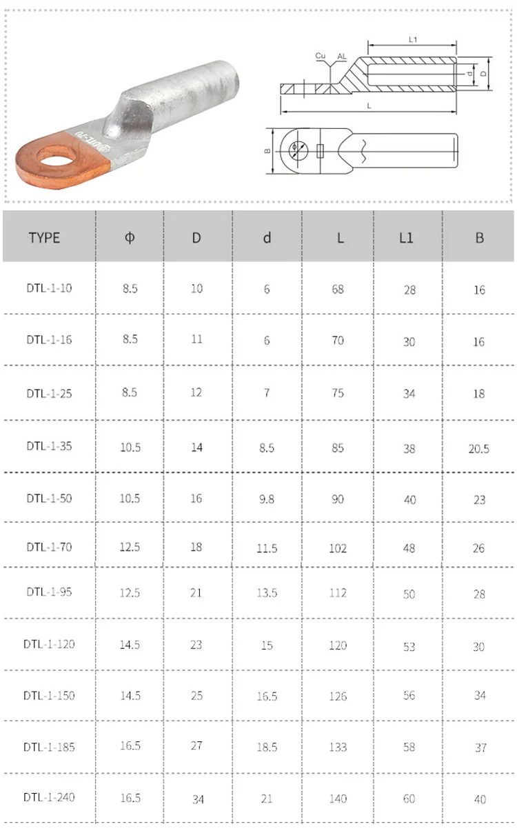 DTL-10/16/25/35/50/70 10 мм2 16 мм 25 мм компрессионный алюминиевый медный биметаллический клеммный соединитель наконечник электропитания