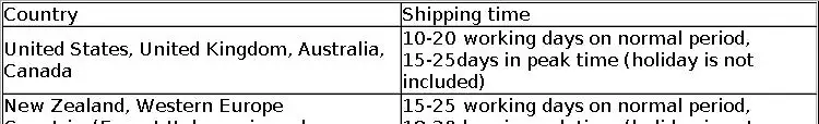 3. Доставка обычно занимает 10-35 рабочих дней. (С понедельника по пятницу, за исключением праздничных дней) точная доставка варьируется в зависимости от страны. Иногда требуется немного больше времени из-за таможенного осмотра, местной отправки или по другим причинам. Если вы не можете получить товар в течение 35 дней с даты оплаты, пожалуйста, напишите нам.