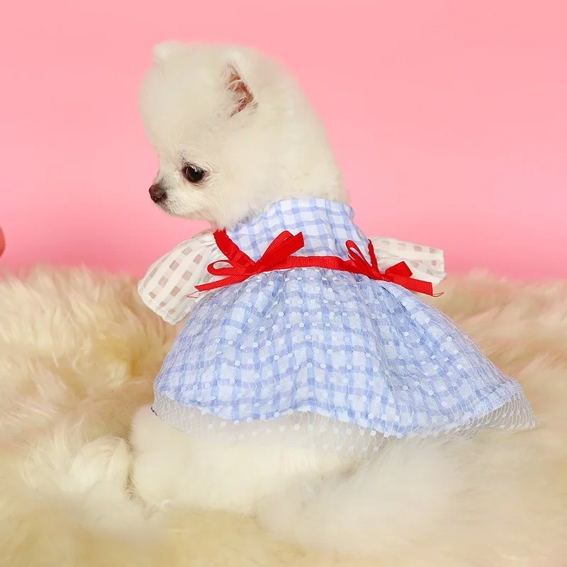 Корея Стиль для маленьких больших собак платья с бантом для девочек, красные, синие ленты с юбкой до пачкой юбка весна-лето, костюмы для питомцев, тцу вечерние Свадебные пальто