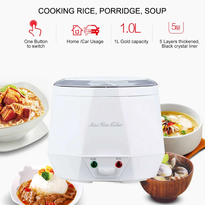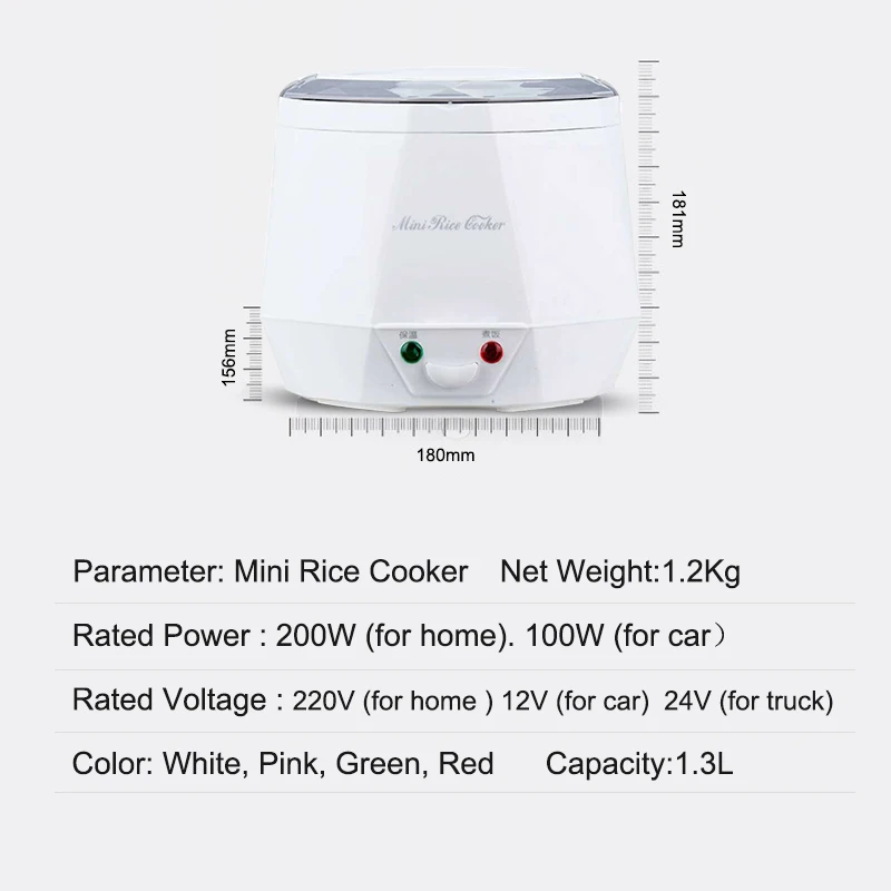 Наименование товара: Мини рисоварка Вес нетто: 1,2 кг Номинальная мощность: 200 Вт (для дома) Номинальное напряжение: 220 В (для дома) 12 В (для автомобиля) 24 В (для грузовика) Цвет: белый, розовый, зеленый, синий Емкость: 1,3л