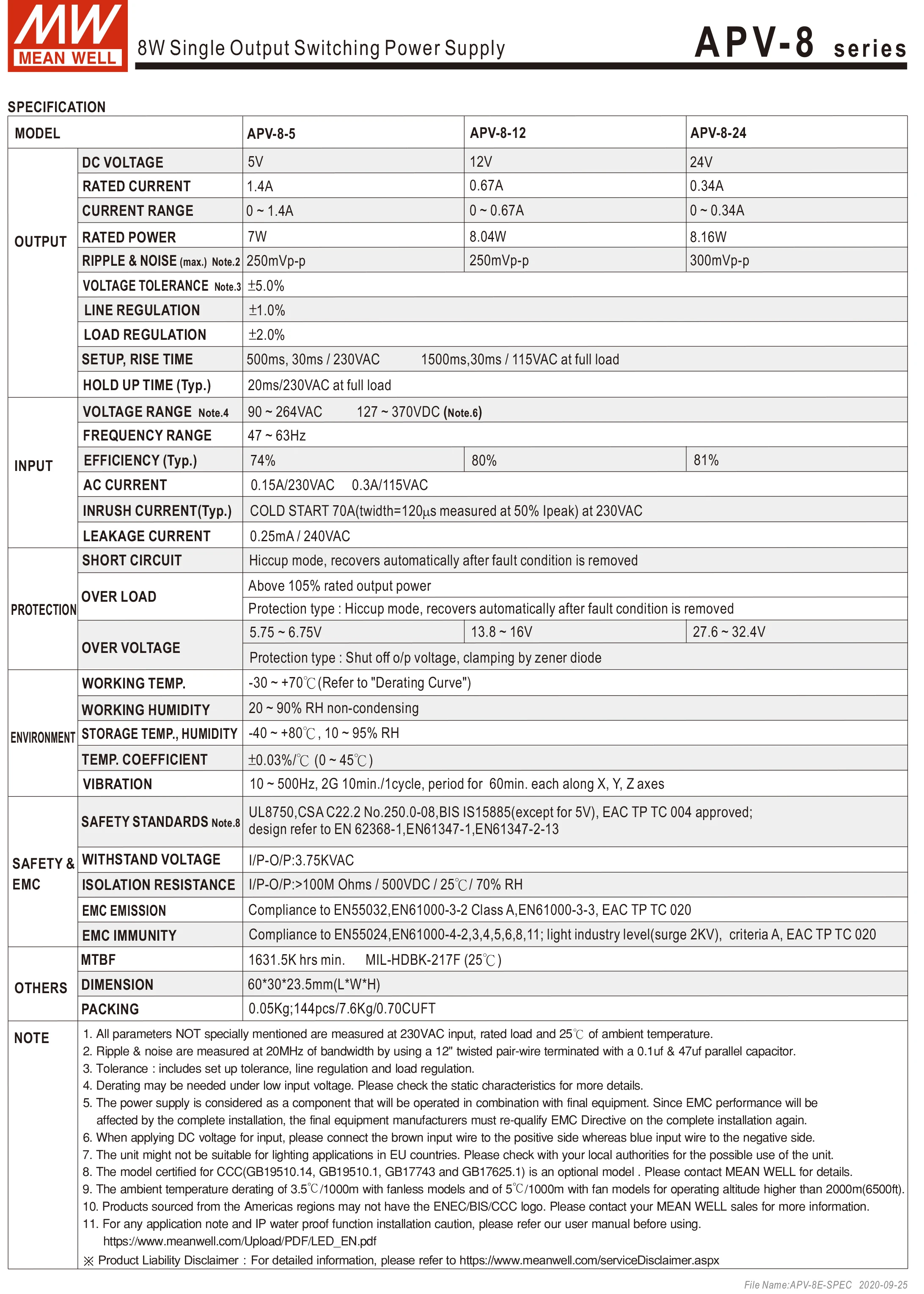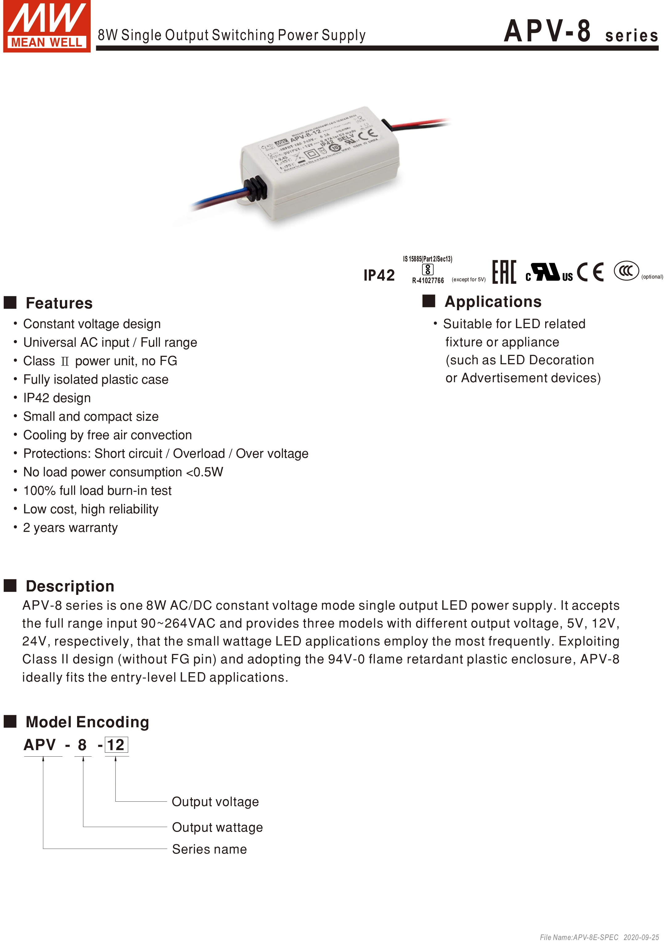 Особенности ● Конструкция с постоянным напряжением ●Универсальный вход переменного тока 1 полный диапазон ●Блок питания класса II, без FG ●Полностью изолированный пластиковый чехол ● Дизайн IP42 ●Маленький и компактный размер ●Охлаждение свободной воздушной конвекцией ● Защита: короткое замыкание от перегрузки/перенапряжения ●Потребляемая мощность без нагрузки <0,5 Вт ● 100% испытание на обгорание при полной нагрузке ● Низкая стоимость, высокая надежность ● 2 года гарантии Мобильные приложения ●Подходит для светодиодных светильников или приборов (светодиодный, светодиодных украшений или рекламных устройств) Описание Серия APV-8-это один светодиодный источник питания с постоянным напряжением переменного/постоянного тока на 8 Вт. Он принимает входной ток полного диапазона 90 ~ 264 В переменного тока и обеспечивает три модели с разным выходным напряжением, 5 В, 12 В, 24 В, соответственно, что малые мощсветодиодный ные приложения используют чаще всего. Взрывобезопасная конструкция II класса (без контакта FG) и огнестойкий пластиковый корпус 94 в-0, APV-8ideally подходит светодиодный светодиодных приложений начального уровня. Для справки, пожалуйста, выполните следующие действия, чтобы проверить действительность наших продуктов. Шаг 1: Откройте Официальный сайт MeanWell на www.meanwell.com Шаг 2: нажмите кнопку «Сервис» в верхней части страницы и найдите «отчет об инспекции контроля качества» Шаг 3: Введите серийный номер и нажмите «Поиск»