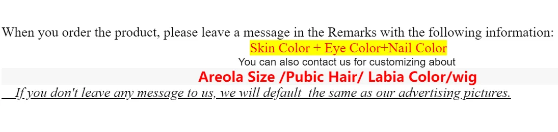 Размер Areola/лобковые волосы/цвет губ/парик #Если вы не оставите нам никаких сообщений, мы по умолчанию будем такими же, как на наших рекламных изображениях.