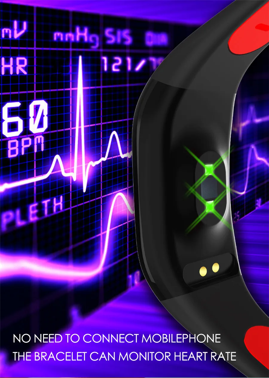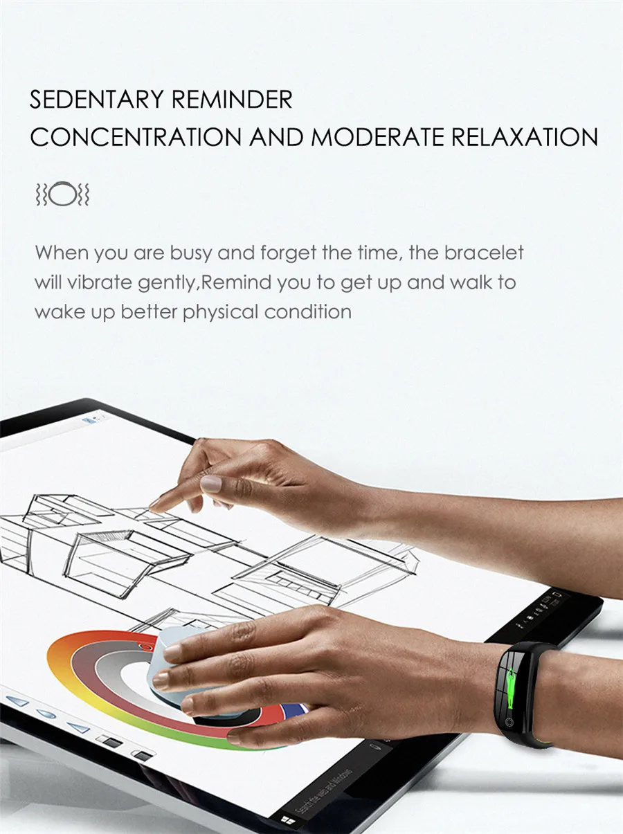 Features: 1. Heart rate monitoring, blood pressure monitoring, sleep monitoring, sedentary reminder, always pay attention to your health, and give yourself and your family a health guarantee. 2. Support female physiological period function reminder, even if the work is too busy, you are not afraid to forget. 3. Pedometer,Step Traker, distance, calories, stopwatch, countdown, call reminder (caller number/name), message reminder, alarm reminder, anti-lost reminder, sedentary reminder, remote control photo, lift wrist bright screen, etc., Make your life easier. No GPS module, support GPS track query. 4. IP68 deep waterproof, no fear of sweat, rain. It makes you feel at ease when you do exercise. 5. Support multi-language, Bluetooth 4.0 Description: App operating system: for IOS8.0 or above,for Android4.4 or higher Gsencor sensor: KXTJ3-1057 Master: nRF 52832 Heart rate sensor: Yiguang PD70-01C-TR7 Vibration reminder: motor vibration reminder Waterproof rating: IP68 Display: 1.14" 135*240 resolution TFT Bluetooth: BLE 4.0 Strap material: silicone strap Host size: about 47*24*13mm/1.85*0.94*0.51inch Machine size: about 260*24*13mm/10.24*0.94*0.51inch Operation: single touch, lift the wrist screen will bright. Battery: polymer lithium ion battery Battery capacity: 100 mAh Standby time: 7-10 days Charging method: magnetic charging cable Charging time: about 2 hours Supported languages: Chinese, English, German, Russian, Japanese, French, Korean, Portuguese, Spanish, Italian, Persian, Vietnamese. Packing list: 1* smart bracelet 1* charging cable 1* instruction manual