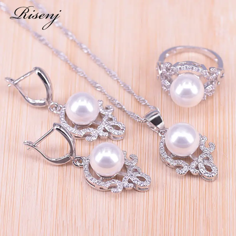 Женский свадебный жемчужный комплект Risenj, изящное ювелирное изделие из стерлингового серебра 925 пробы, белое ожерелье, серьги, кольцо, браслет