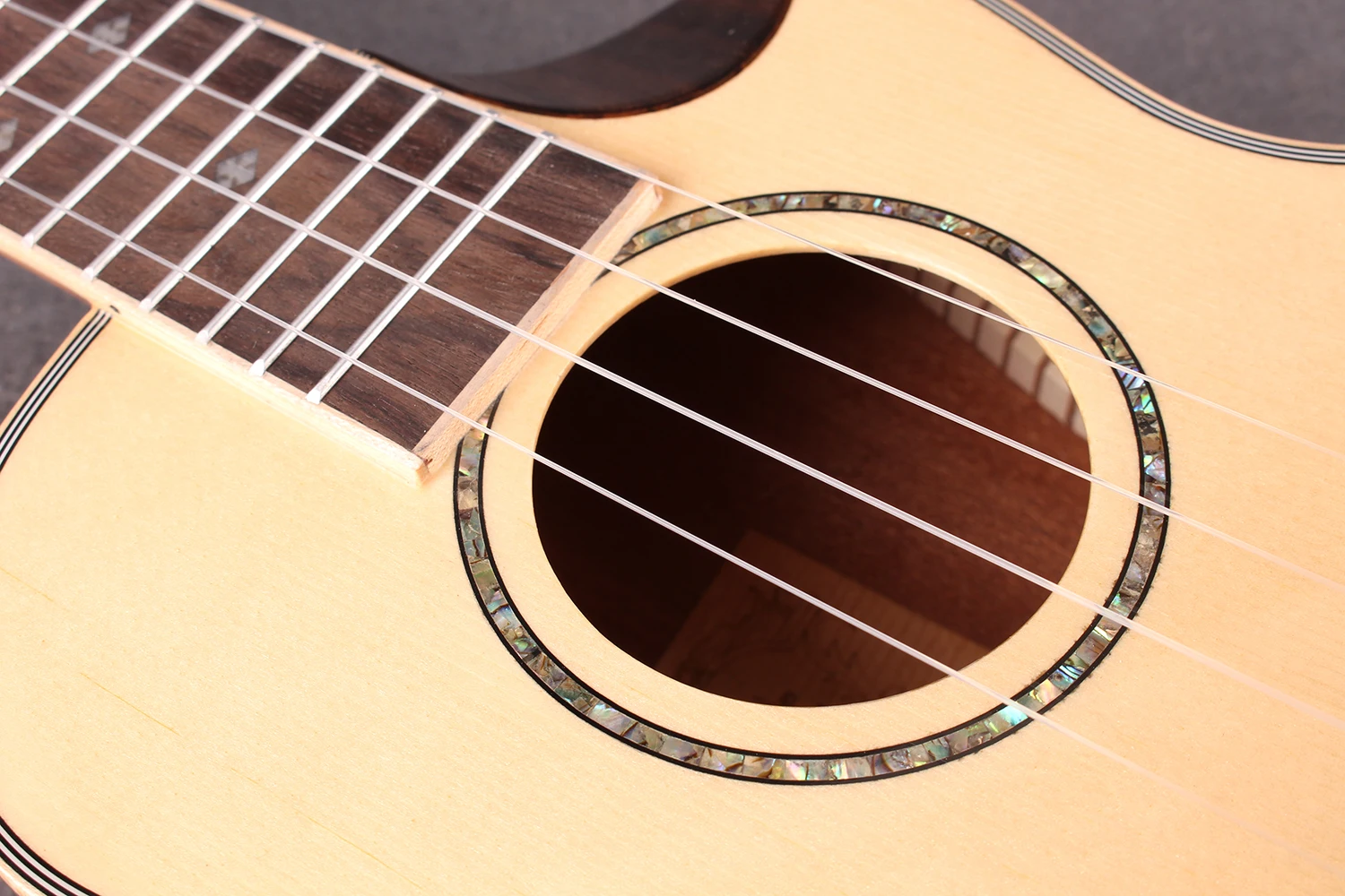 Product Description Size:Concert Top: solid Spruce Back and Side: mahogany Fingerboard: rosewood & beautiful flower inly String:Carbon wtring Neck: Mahogany Finish: glossy Case: Hard EVA case One of the three random colors Ukulele is packed by Hard EVA case and outside with hardpaper box, very strong picking.