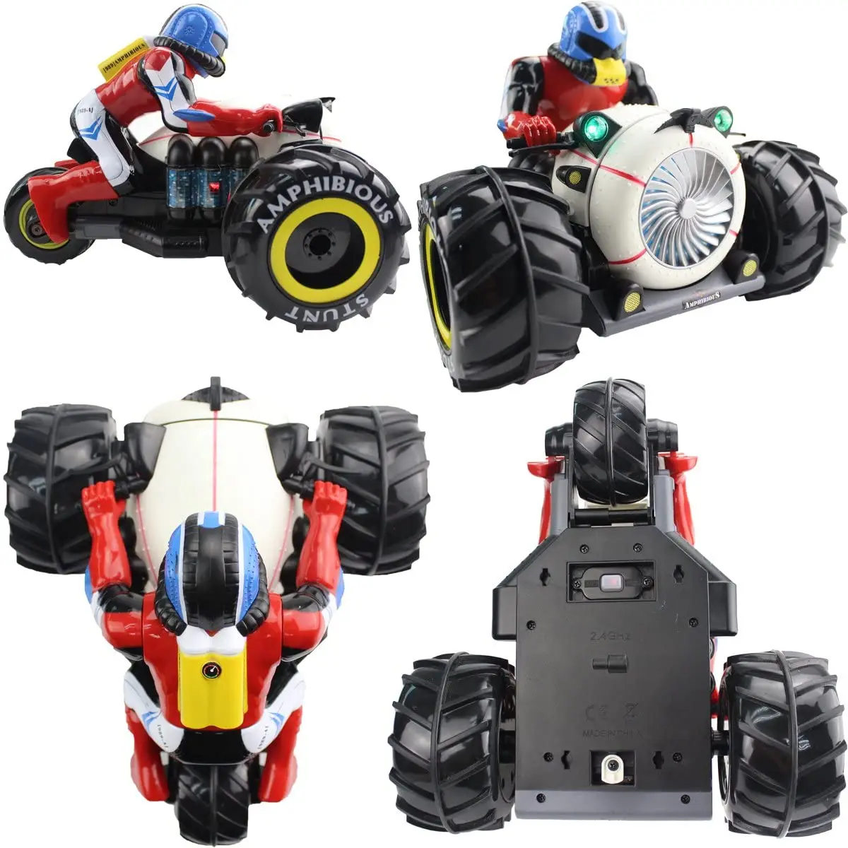 Технические характеристики: Размеры: 27x23x19 см Цвет: белый с красным Батарея: 7,2 V 700 мАч никель-кадмиевый аккумулятор Мощность Pu: 2x1,5 AA Диапазон управления: до 30 м Время зарядки аккумулятора: до 60 м Время игры: до 20 мин Особенности: Вперед/назад, светодиодный светильник Может двигаться на всех видах поверхностей 360 градусов вращения Возможность сделать Вертикальный флип Комплектация: 1 x RC Мотоцикл амфибия 1 x дистанционный пульт 1 x Батарея Зарядное устройство-1 шт.; Инструкция (1 шт.)