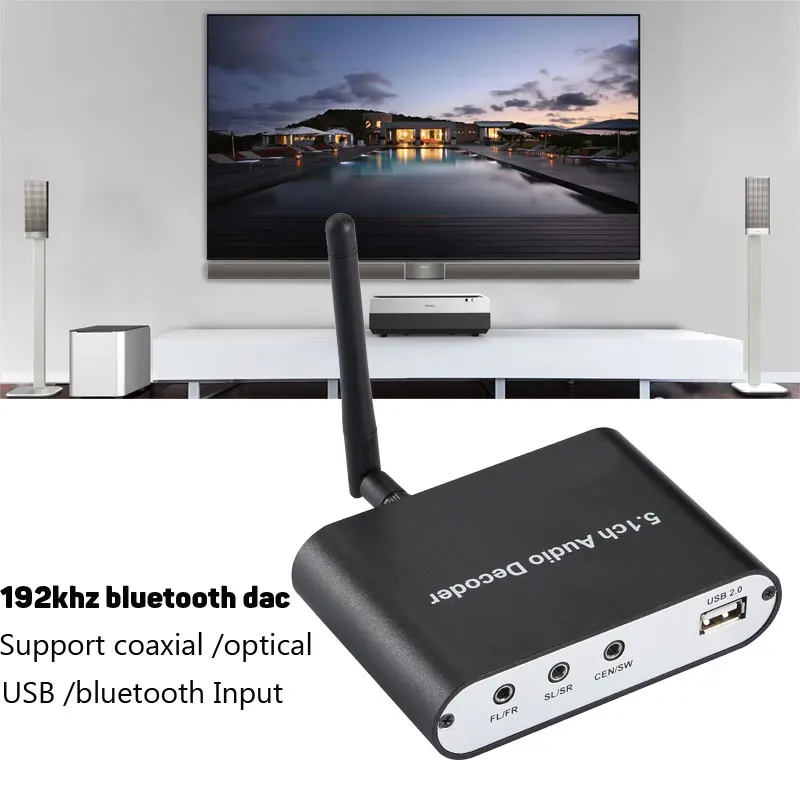 1. Sopport 2 optical input, one coaxial input one Bluetooth 5.0 input, one USB 2.0 input interface. you can choose the input source by the input button randomly. 2.Support one 5.1CH analog audio output. 3. Audio format: DTS, DTS-ES, AC3, WAV, FLAC,APE, AAC. WMV, MP3, M4A Digital. 4. Support bluetooth 5.0 receiver. 5. Support USB 2.0 6. Support 5.1CH 2.0CH audio output mode selection,FL/FR active when 2.0ch output mode. 7. Support DTS AC3 hardware decoding and PCM software decoding.