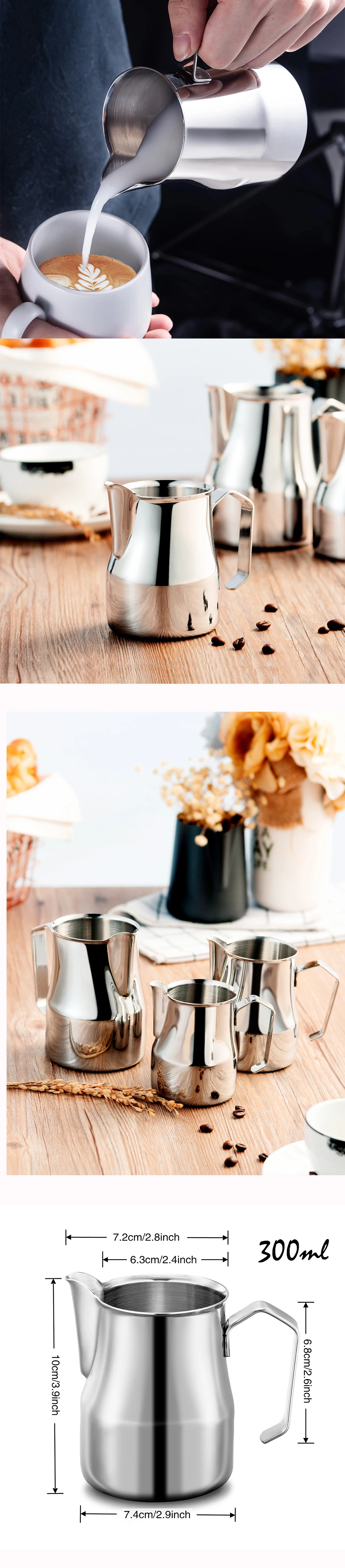 【Хорошее качество и Емкость 】: Изготовлен из пищевой нержавеющей стали, прочный и долговечный, тонкая работа. Емкость кувшина для вспенивания молока 350 мл/12 унций с мерными отметками с обеих сторон. Нержавеющий, грязеотталкивающий, термостойкий и нетоксичный