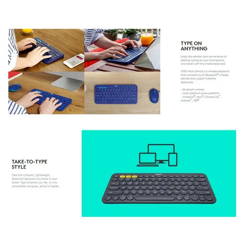 Take this compact, lightweight, Bluetooth keyboard anywhere in your home. Type wherever you like, on any compatible computer, phone or tablet.