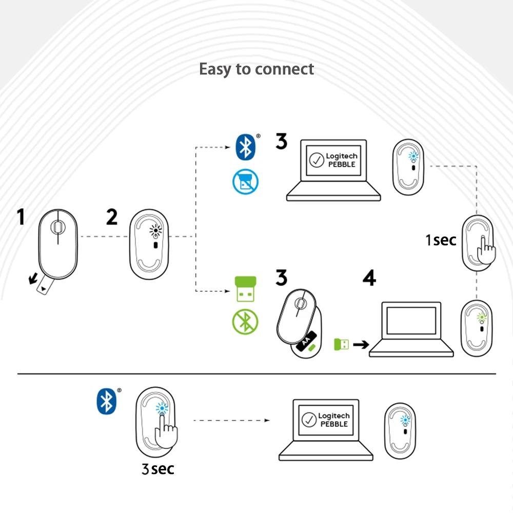 Connect simply with Bluetooth® or the tiny 2.4 GHz USB receiver -stored in the magnetic cover of the mouse- and never worry about annoying drop-offs or lag up to a 32.8 ft (10m) range.