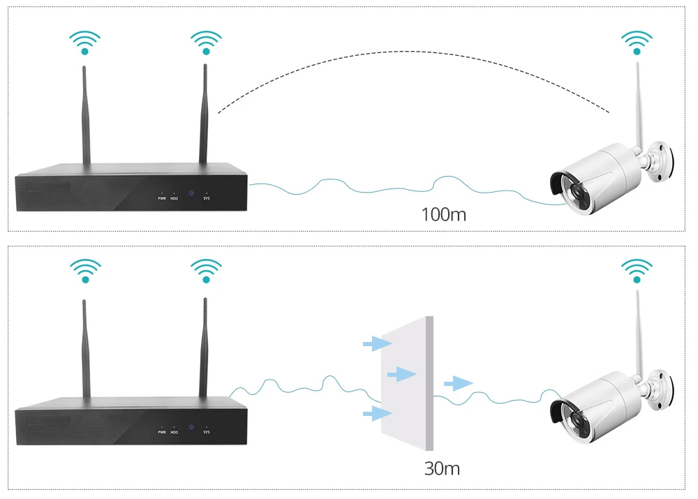 Беспокоясь о рабочее расстояние? Камера и NVR, встроенный модуль Wi-Fi, сигнал сильный и стабильный. Расстояние передачи до 100 м на открытой местности. С барьером между камерой и NVR, сигнал передает макс. 30 м. Более того, вы можете использовать релейное соединение для Двойного расширения площади.