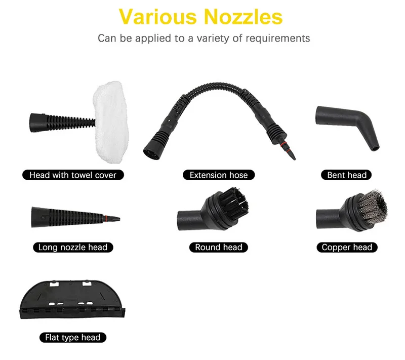 -Простой в использовании, легкий и портативный с 3 м шнуром питания для легкой подвижности -Высокая температура и высокое давление пара для удаления пола, дверей и окон, одежды, грязи и пятен -Оснащен различными насадками для различных функций очистки -Стерилизация, Экологически чистая и эффективная. Пар, выбрасываемый после нагрева, может достигать высокой температуры 130 градусов. С Для очистки воздуха. Формальдегид в помещении может быть эффективно удален методом увлажнения воздуха в помещении -Для увлажнения воздуха. Естественное высвобождение пара в воздухе, регулировка влажности воздуха