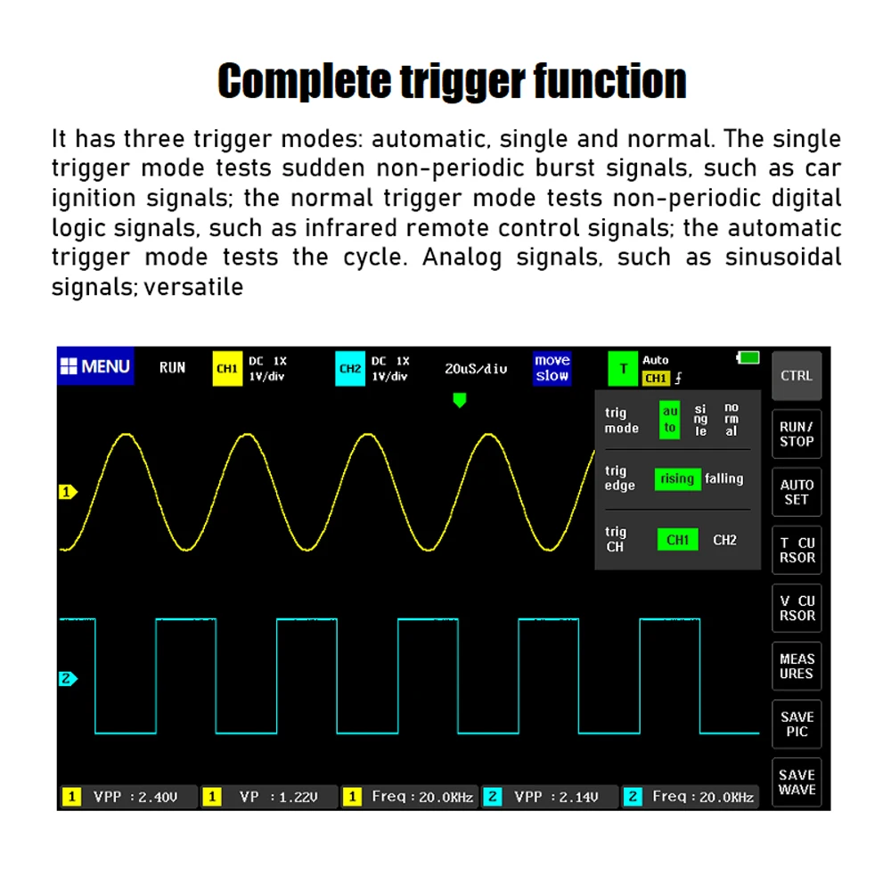Функция измерения курсора, удобно вручную измерять период, частоту и напряжение.