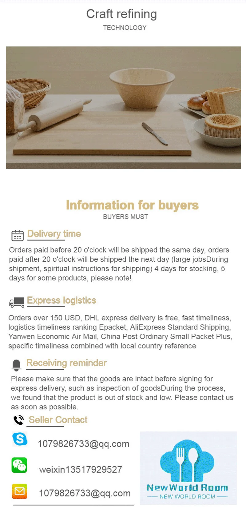 Материал: бук Размеры: 14*2,5 см 14,5*2,5 см Преимущества: без плесени, без трещин, без горячих рук, без колючек Используйте Внимание 1. При первом использовании деревянной посуды вы можете использовать озоновый слой дезинфекционного шкафа для дезинфекции. Для дезинфекции без озона вы можете замочить его в теплой соленой воде в течение 1 часа, затем промыть его водой в обычном режиме и поместить в вентилируемое и сухое место после очистки. 2. Дезинфекционные шкафы, микроволновые печи нагреватели, индукционные плиты и другие высокотемпературные электрические приборы запрещены 3. Воздействие Солнца, кипячения воды, замачивания кислотной воды запрещено 4. Использование растительного масла для протирания и сушки может увеличить время использования Примечание: изделия из дерева отполированы вручную, могут быть ошибки в размере, пожалуйста, обратитесь к фактическому продукту