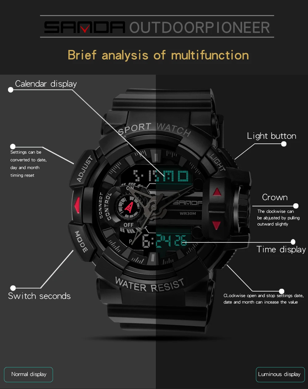 • Функции: календарь, неделя, хронограф, будильник, ретранслятор, формат времени 12/24 часов, светящийся, секундомер