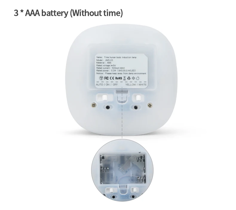 Материал: пластик Изделие: светодиодный настенный светильник с часами Три датчика s: инфракрасный датчик человеческого тела + светильник ности + датчик гравитации. Тип: на батарейках/USB зарядка Питание: 3 * AAA батареи (не входят в комплект)/Встроенный перезаряжаемый аккумулятор (600 мАч) Цвет светильник: два цвета s можно переключать (теплый белый/белый) Время работы в режиме ожидания: около 1200 часов Цвет корпуса: белый Размер: 8,8*8,8 см
