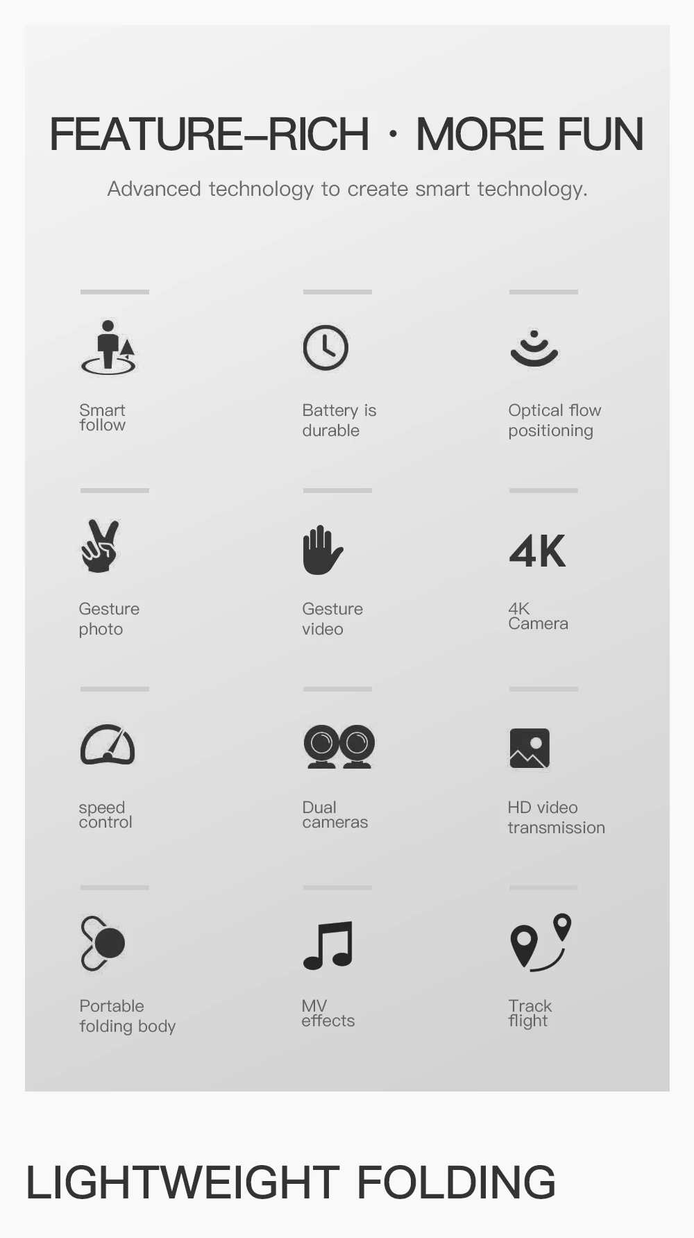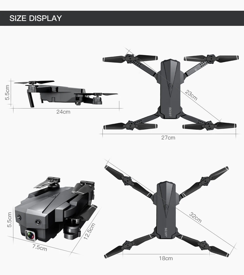 Частота: 2,4GКанал: 4chГироскоп: 6 A XISБатарея квадрокоптера: 3,7 V 1200mAh литиевая батарея (входит в комплект)Батарея передатчика: 2 х 1,5 элемент питания AAА (в комплект не входит)Время зарядки: 120 минутВремя полета: 15 минутВес дрона: 113,2 г (с батареей)Расстояние дистанционного управления: 150 мЦвет: черныйКамера: 1080P/4K/4K двойная камераЧетырехсторонний Размер: 28*22*5,5 см (рука не сложена)Размер: 12*7,5*5,5 см (в сложенном состоянии в четырех ногах)Характеристика:-С складной ручкой, она маленькая и легко переносится.-Имеет высокую функцию режима удержания для обеспечения стабильного полета.-С функцией Wi-Fi вы можете подключиться к приложению, системе APK, чтобы делать фотографии, видео и передавать изображения в режиме реального времени через мобильный телефон-камеру.-Жесты для фотографирования.-Есть 3 камеры на выбор. Оснащен двойной камерой 1080P/4K/4K, широкоугольной камерой для широкого спектра фотографий и видео высокой четкости.-Нет режима головы, нет необходимости регулировать положение самолета перед полетом.-С функцией возврата одной кнопкой вы можете легко найти свой путь домой.-Анти-помех использует 2,4 ГГц технологии.-4 канала, которые могут быть подняты, опущены, переадресованы, отошли, Левши, правши и свернуты на 360 °.-Шестиосевой гироскоп для более стабильного полета и легкого управления.-Корпус с четырьмя роторами изготовлен из высокопрочного и инженерно-стойкого пластика, легкий и прочный.