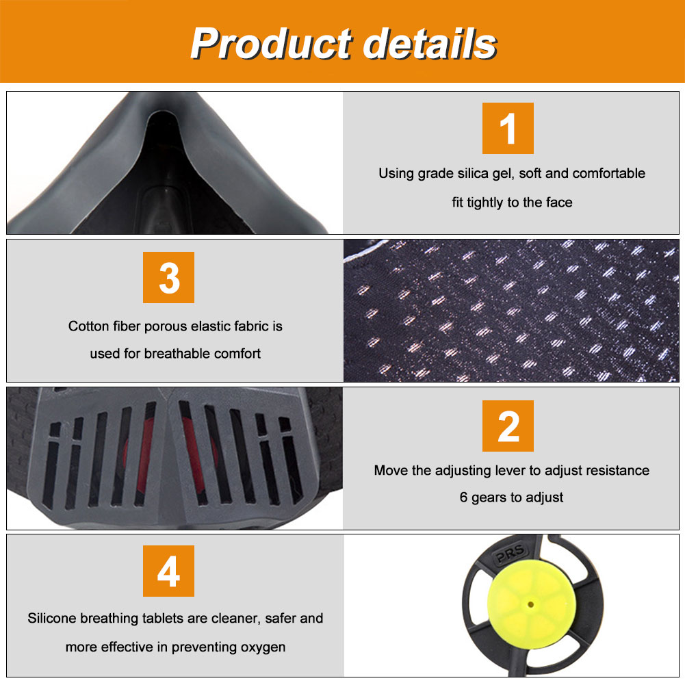 2. Спортивная дышащая маска имеет удобную съедобную силиконовую маску, которая плотно прилегает к лицу. Маска для тренировки имеет воздухопроницаемую и удобную высококачественную хлопчатобумажную эластичную ткань, 6-позиционный рычаг регулировки для регулировки сопротивления, силиконовый дышащий материал более чистый и безопасный, более очевидный эффект кислородного барьера.
