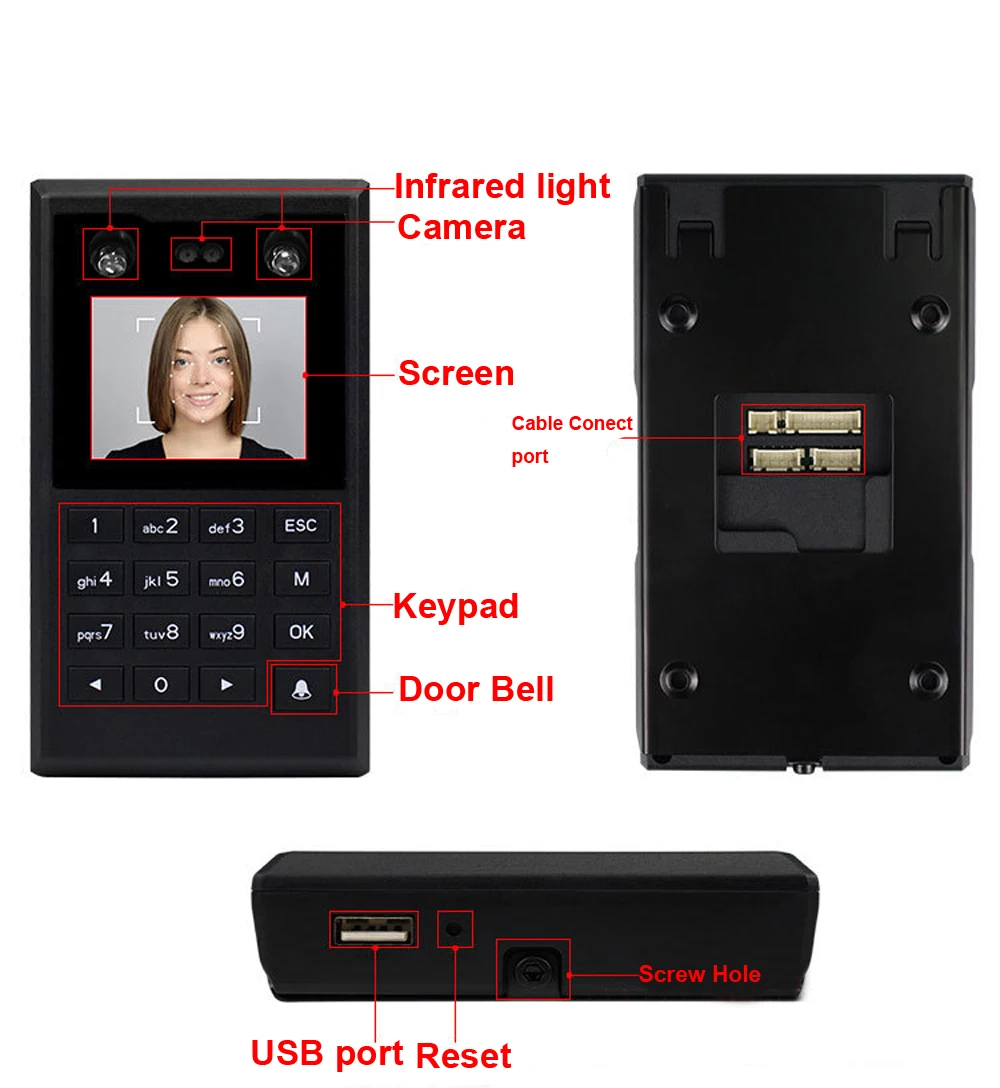 Продукт Особенности 1) 2,8 дюймов TFT Цвет экран. 2) строго следуйте стандарту продукта национальной безопасности. 3) распознавание лица, с высоким разрешением, инфракрасный светильник ночного видения и профессиональная цветная Двойная камера, терминал может Быстрая проверка в любых условиях. 4) поддержка 250 face, 250 пароль, емкость записи 80000 5) поддерживает face, hands, пароль и различные комбинированные методы, чтобы удовлетворить требования различных пользователей. 6) T9, на имя машины, отдел, частоту и другую информацию, можно напрямую выводить Проста в использовании, управление пользователем 7) Поддержка TCP/ IP-способа связи. Поддержка загрузки флеш-накопителя USB. 8) имеет Wiegand26/34 входа/выхода, релейный выход, дверную кнопку звонка. 9) гуманизированная индикация языка, напоминание. 10) поддерживает множество языков: традиционный китайский, английский, испанский, корейский, японский, турецкий, индийский, итальянский, тайский. 11) подходит для входов и выходов из офиса, фабрики, отеля, школы и т. Д.
