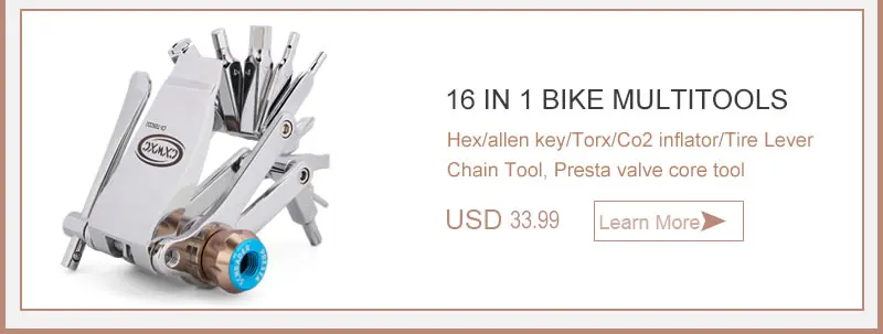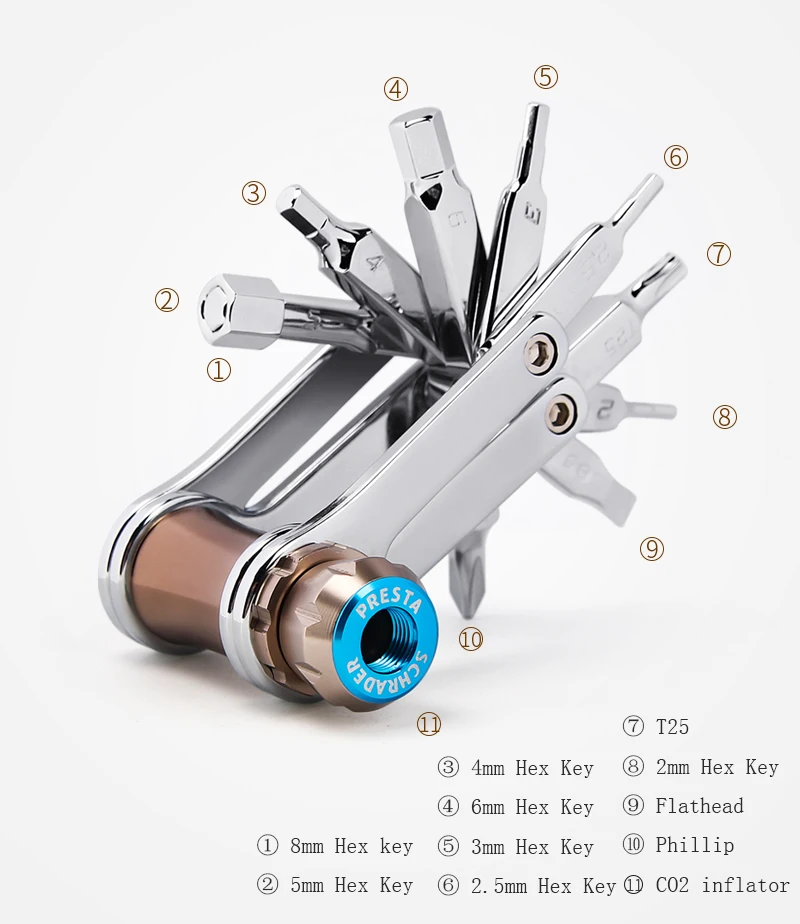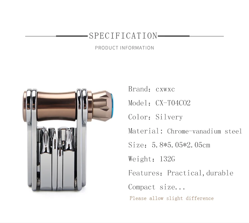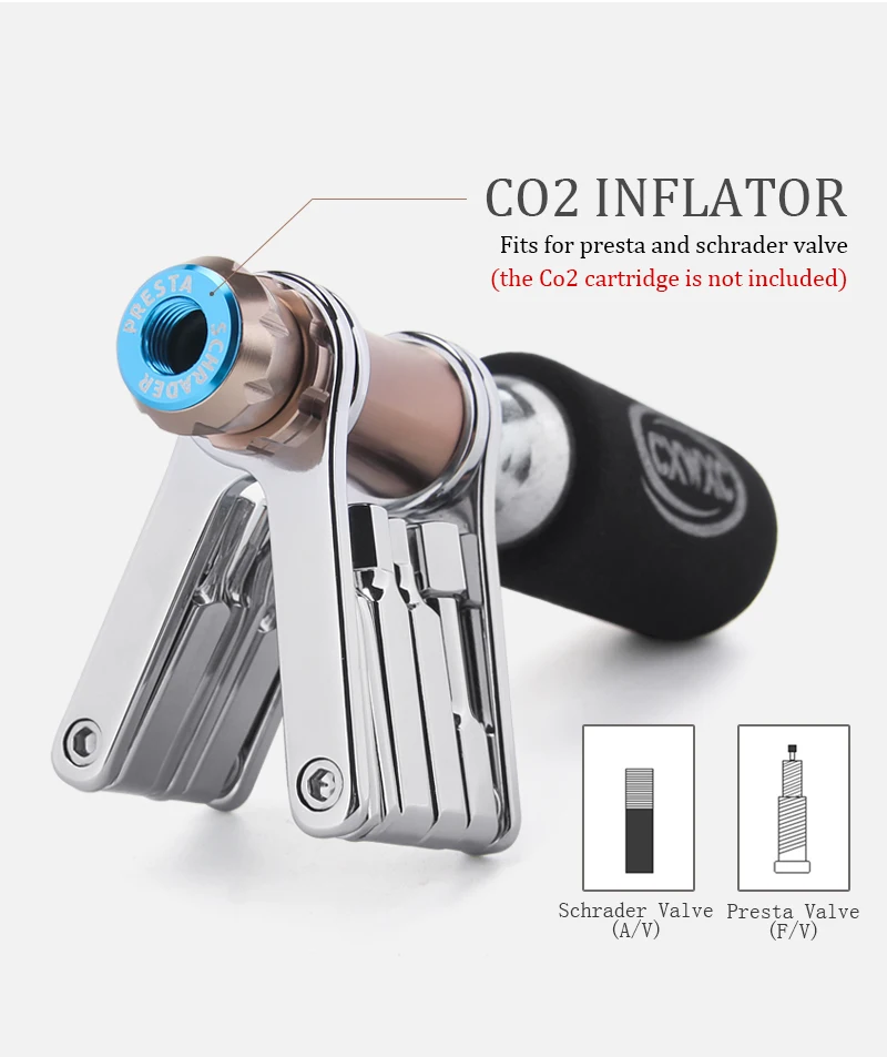 Модель: CX-T04, CX-T05 (проверьте детали в магазине); Вес: 132 г; Материал: сталь Cr-V; Применение: ремонт и обслуживание велосипедов Инструмент в комплекте: 2, 2,5, 3, 4, 5, 6 и 8 мм гаечные ключи, дюймовый стандарт, Torx T25 бит для дисковые тормоза, отвертка с плоской головкой, крестовую отвертку, плюс CO2 адаптер картриджа;