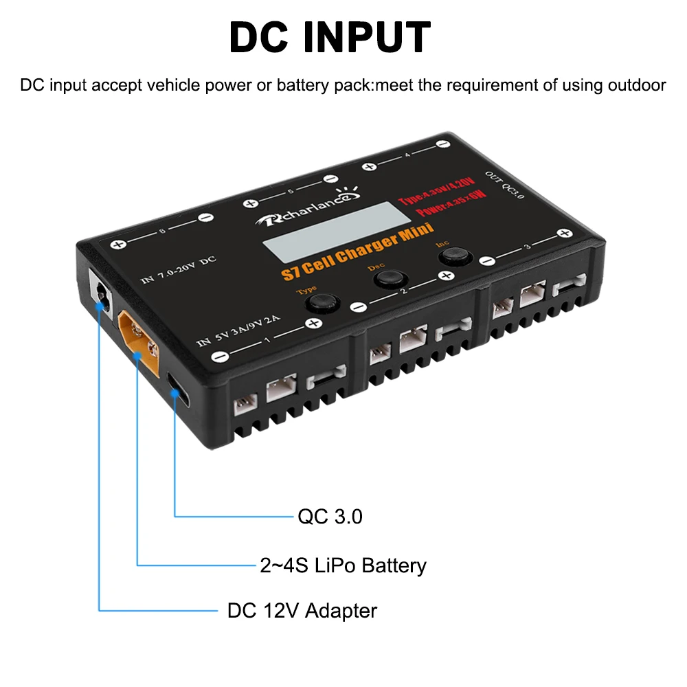 Вход: DC адаптер/2-4S LiPo XT60 / QC 3,0 type-C адаптер