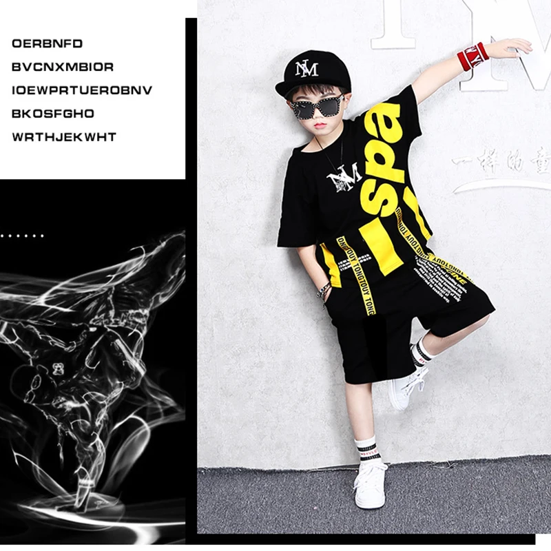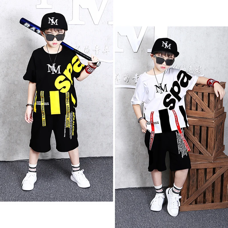 Детский Повседневный комплект одежды из двух предметов с короткими рукавами, спортивные костюмы черный свободный летний костюм с буквенным принтом для маленьких мальчиков