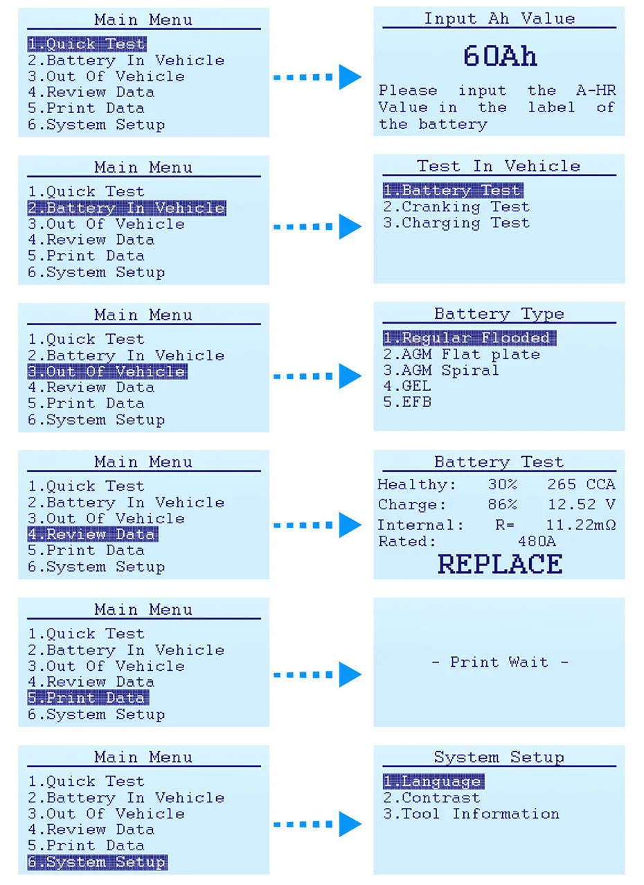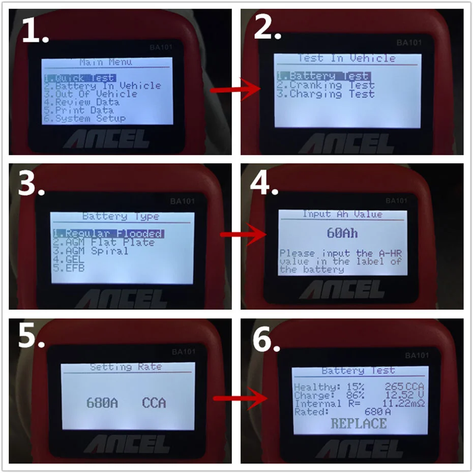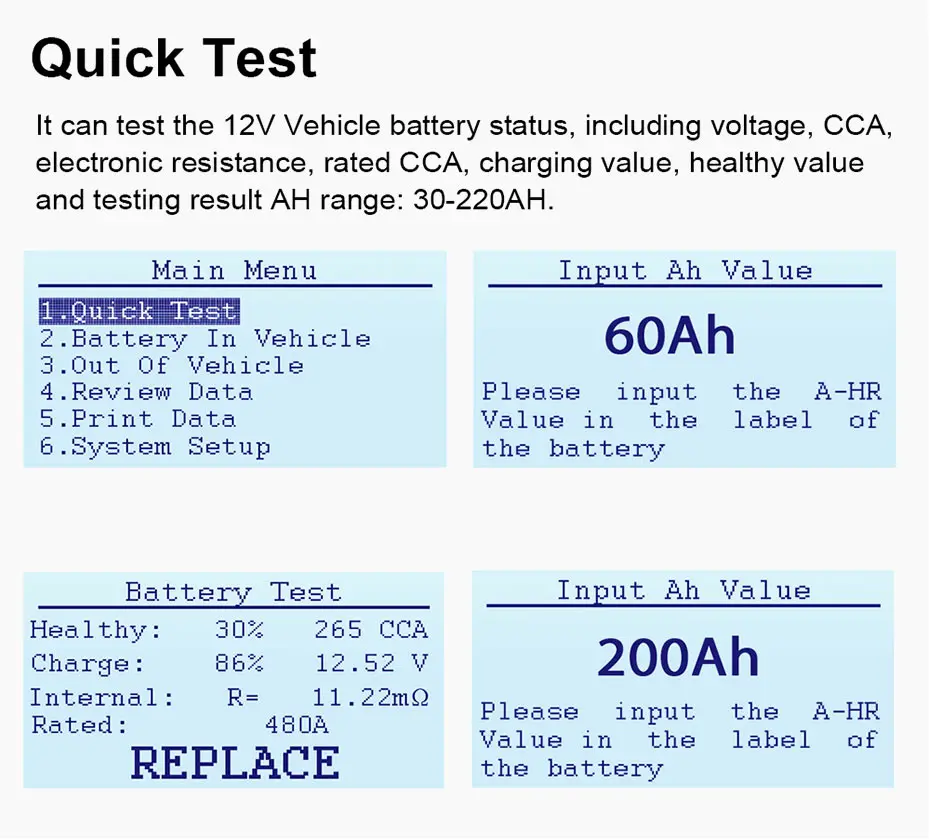 Быстрый тест Он может убедиться, что состояние батареи, включая напряжение, CCA, электронное сопротивление, номинальное CCA, значение зарядки, здоровое значение и результаты тестирования за одну секунду. После ввода номинальной емкости батареи AH valuemdashbattery, которая отмечена на этикетке батареи. Нажмите кнопку вверх/вниз, чтобы выбрать быстрый тест, затем нажмите клавишу ВВОД для подтверждения. Введите Номинальный аккумулятор capacitymdashxx AH, в общем, емкость батареи для автомобиля 12V выше 30AH. Затем нажмите клавишу enter, результат тестирования покажет один из них, так как ниже результат тестирования батареи включает в себя 5 типов: Хороший аккумулятор: батарея без каких-либо проблем, пожалуйста, расслабьтесь в использовании Хорошо, Перезарядка: хорошая батарея, но низкий ток, перезарядка перед использованием. Замена: аккумулятор близок к концу срока эксплуатации или уже достиг его, Замените аккумулятор, в противном случае, за большой опасностью последует. Плохая ячейка, замена: внутренняя часть батареи повреждена, плохая ячейка или короткое замыкание, замена батареи.