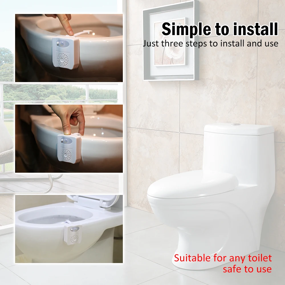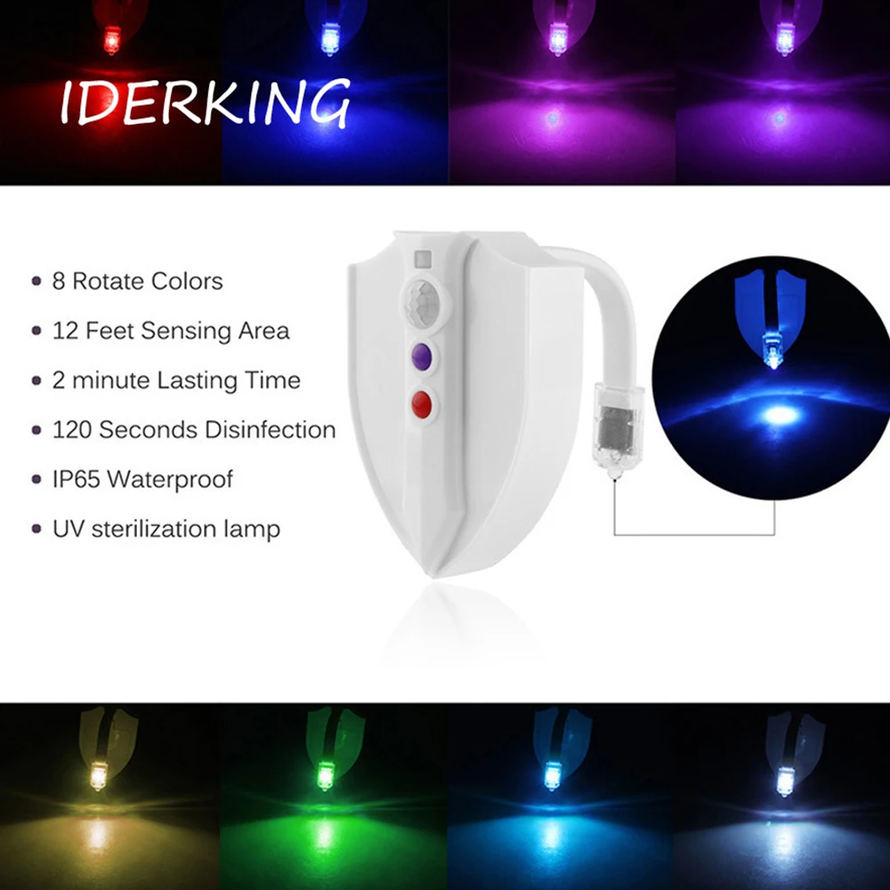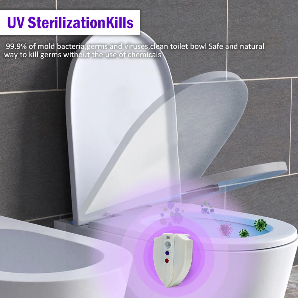 8-цветный УФ дезинфекционный туалетный светильник. При работе, в темных условиях, светодиодный светильник включается автоматически при обнаружении человеческого тела. После того, как человек уйдет в течение 2 минут, система автоматически обнаруживает и включает УФ-дезинфекцию в течение 2 минут. УФ не влияет на срок службы.