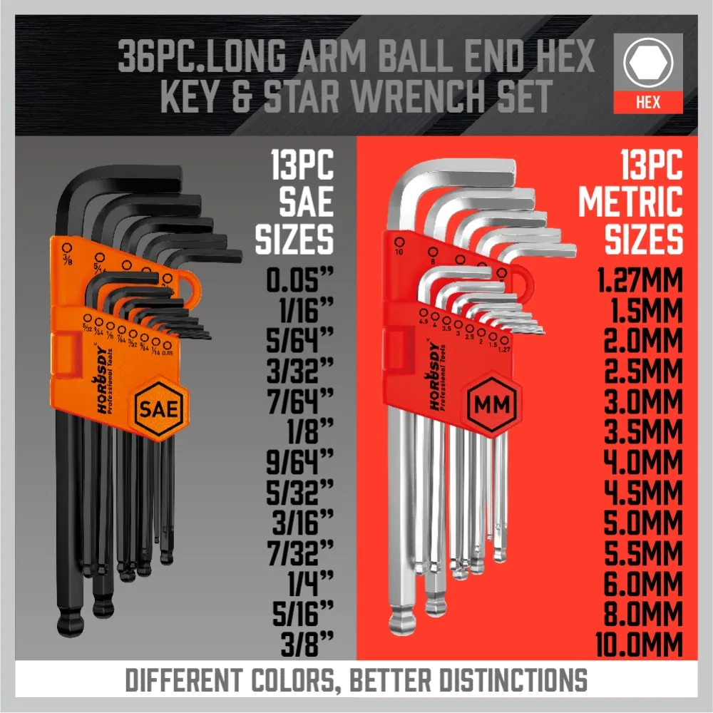 13 ключей SAE: 3/64 ", 1/16", 5/64 ", 3/32", 7/64 ", 1/8", 9/64 ", 5/32", 3/16 ", 7/32", 1/4 ", 5/16", 3/8"